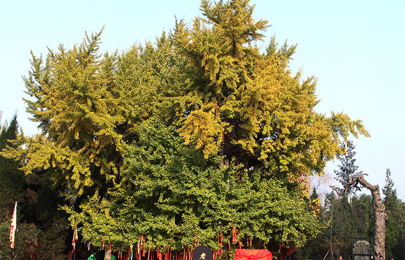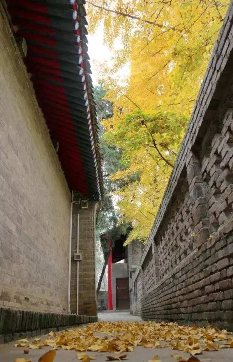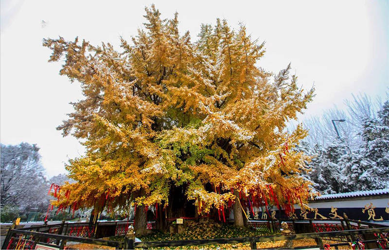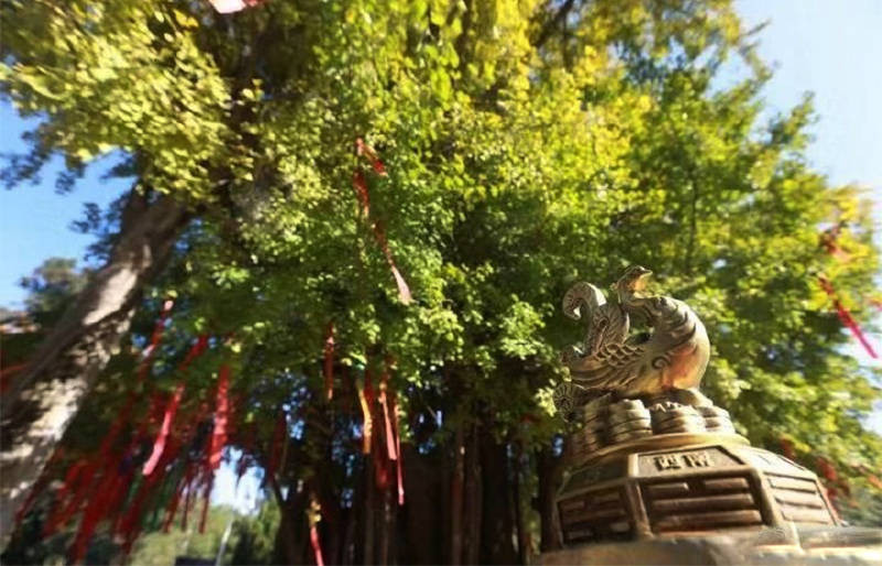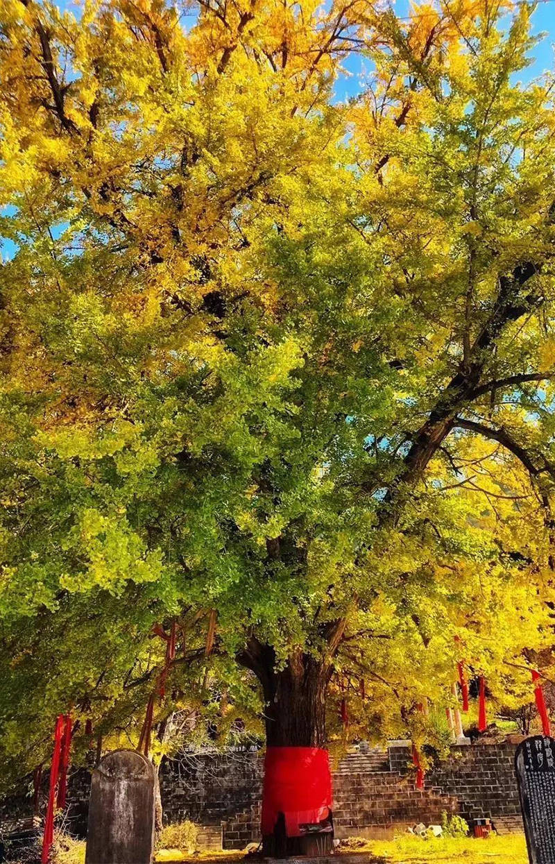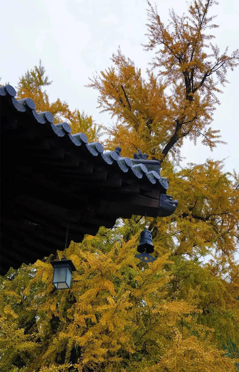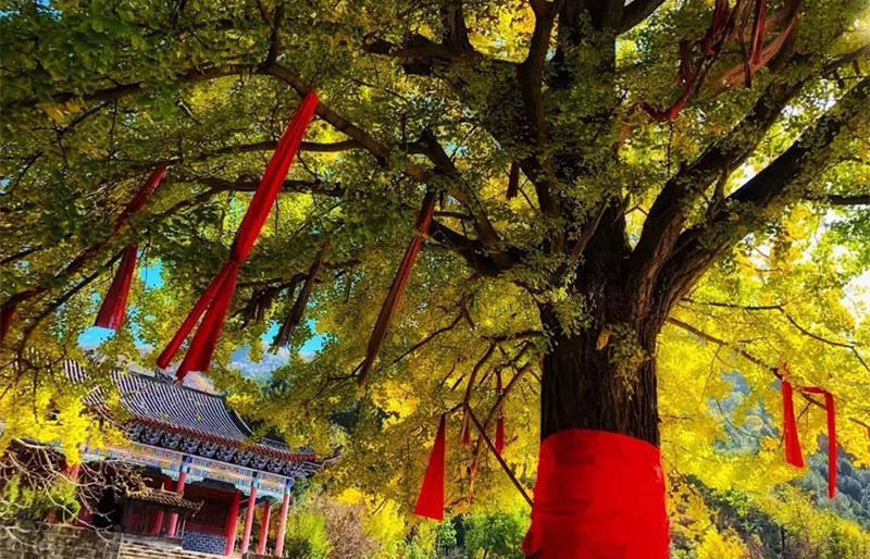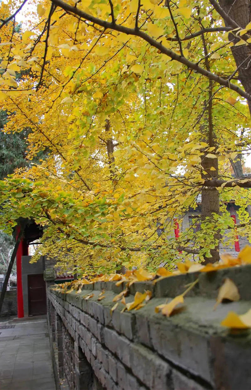 每年金秋时节,满树金黄灿若彩蝶,叶落时,金黄铺满整地,梦幻缤纷中,古朴神秘的氛围笼罩,古老的银杏树伴着古寺,古寺陪着古树,交相辉映。