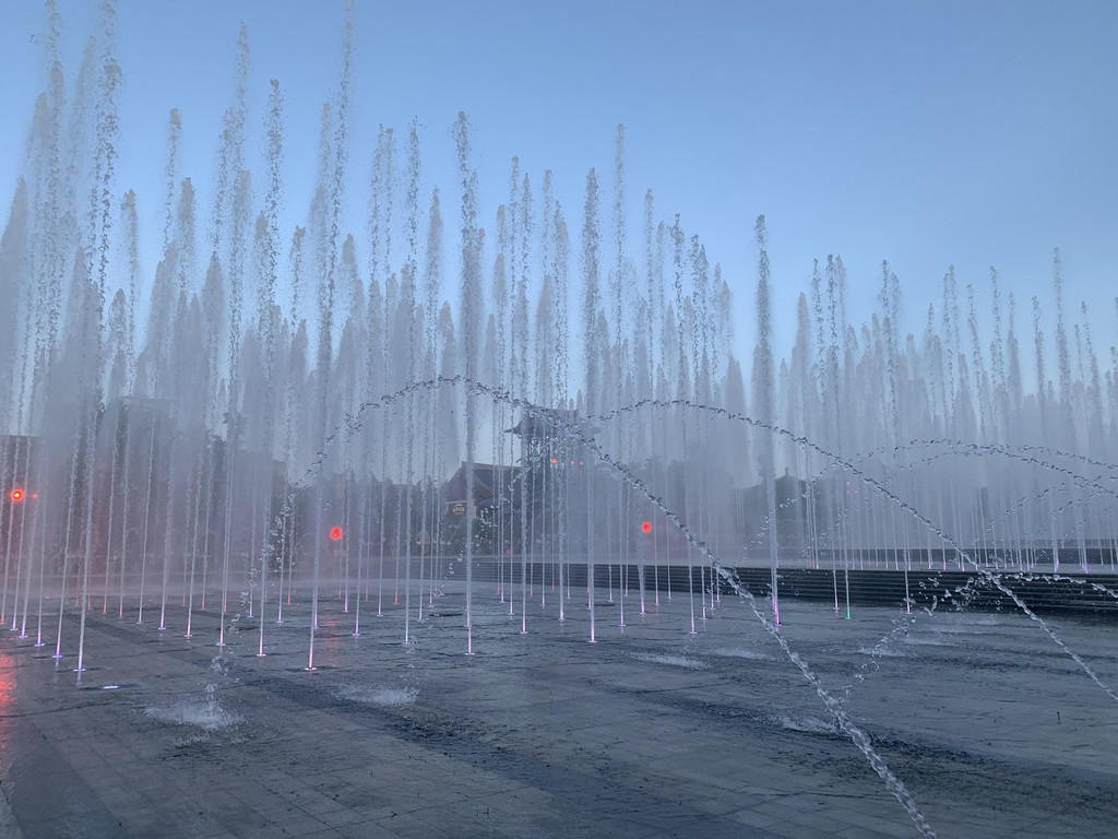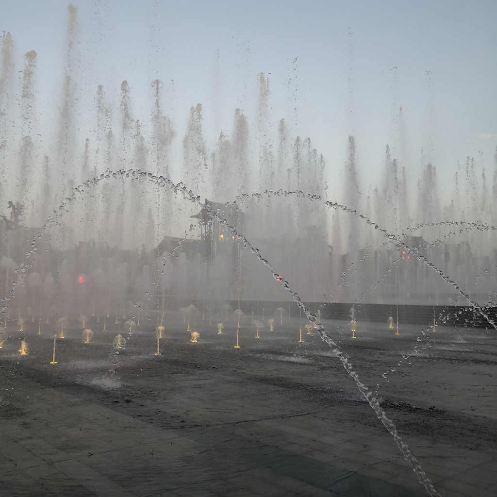 最好的观赏喷泉角度应该是南北两侧,一边是正对大雁塔,一边是大雁塔对面飘着云朵的晴空,但美中不足全部暴露在阳光下,还是躲在树荫中看吧,时间不长,大概10分钟左右,激荡音乐伴奏中大雁塔下的喷泉还是很值得一看,溅起的水花驱散了热气,带来丝丝凉爽。