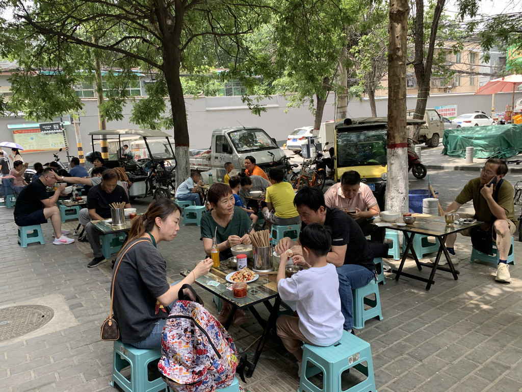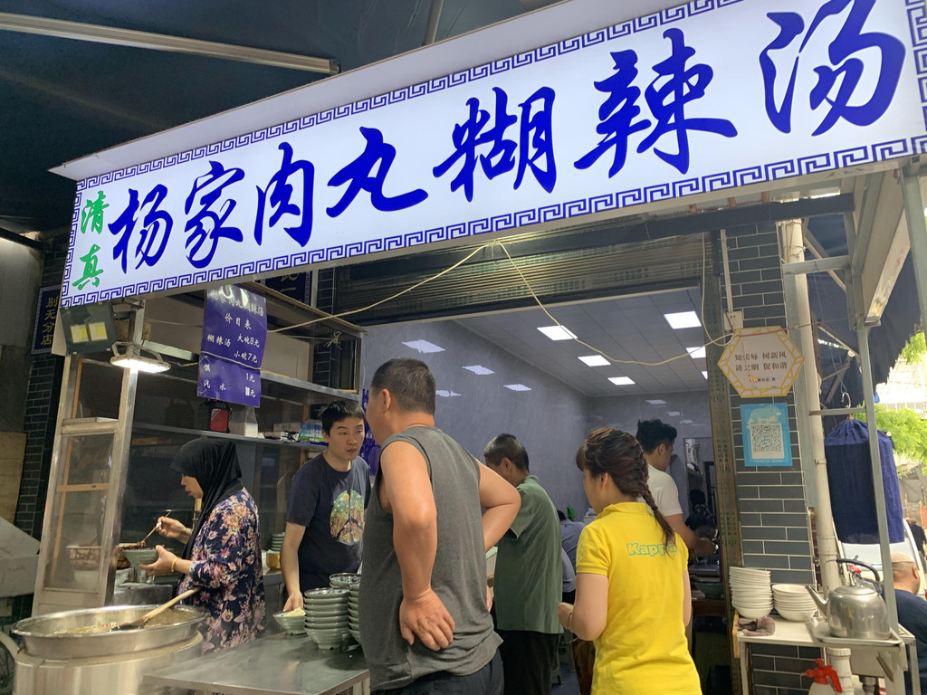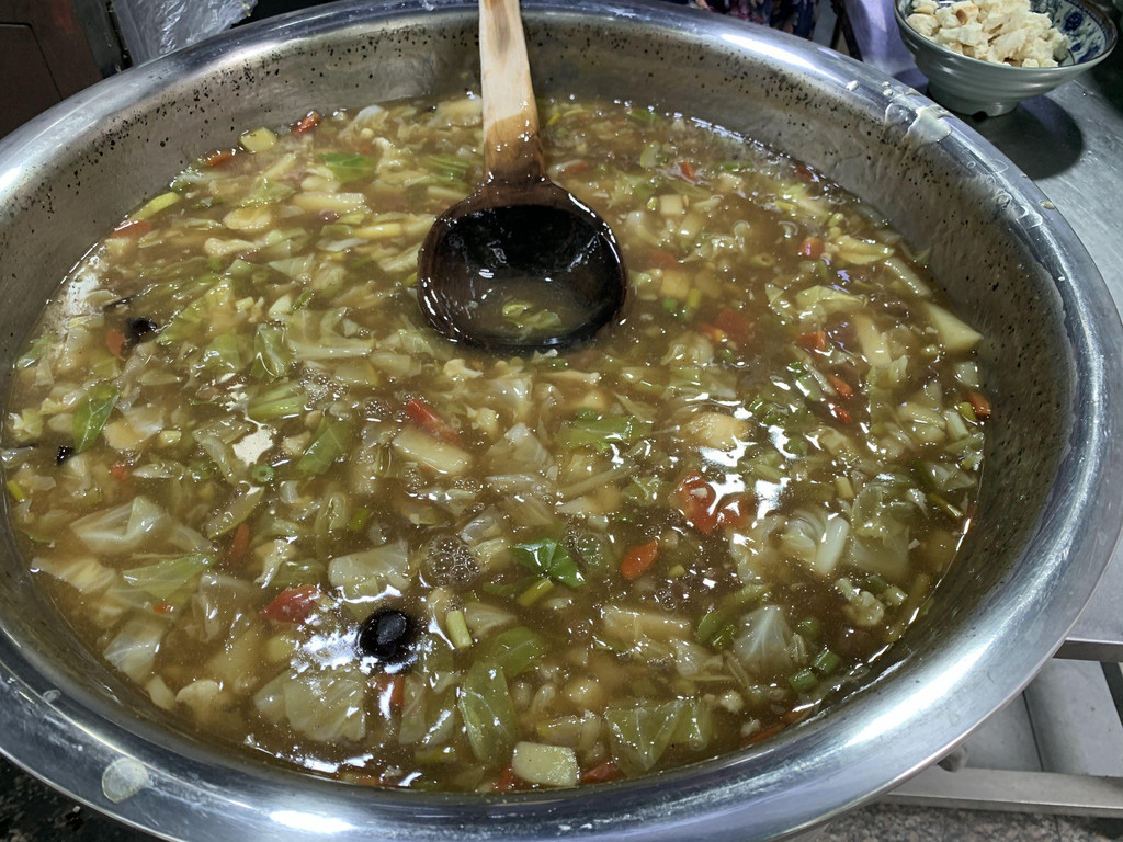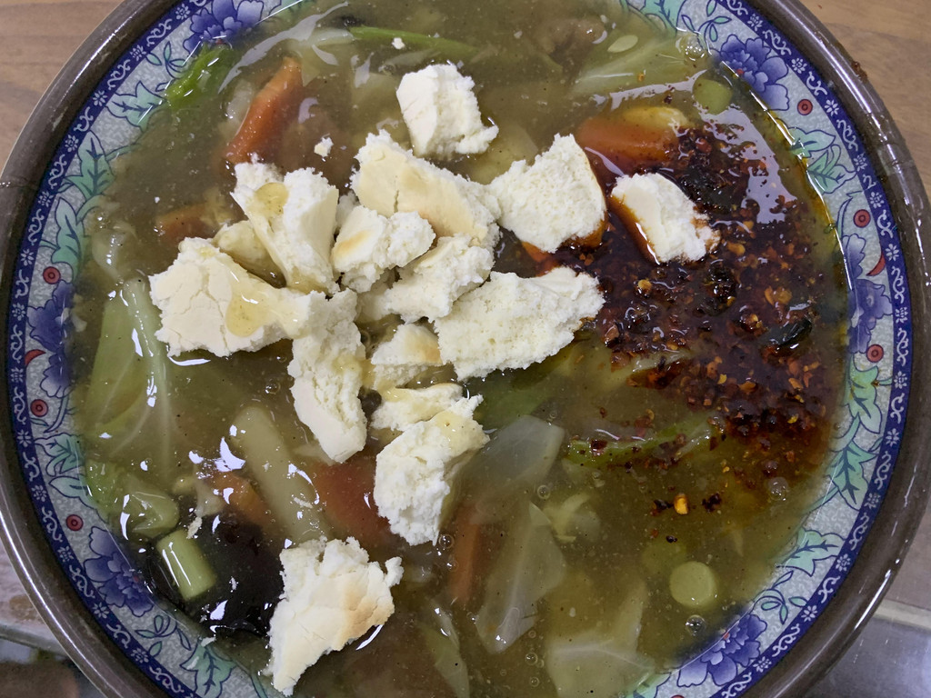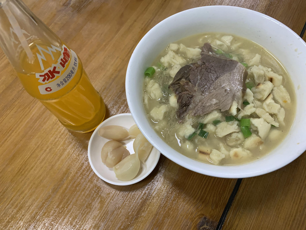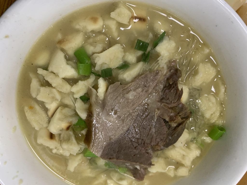 还不到饭点,屋里屋外就坐满了人,交钱领馍去自己掰,掰好端碗排队领一个号牌,大厨做好了叫号端过来,我们没有耐心,已经尽力了还是掰的大大小小不尽人意,看到旁边一个四十多岁的中年男人,我们掰馍的时候进去的,到我们吃完,他还没有掰完,真的好有耐心啊。突然想到掰馍应该也很解压吧,如果心情不好,搞两个馍,估计掰完也就心平气和了。