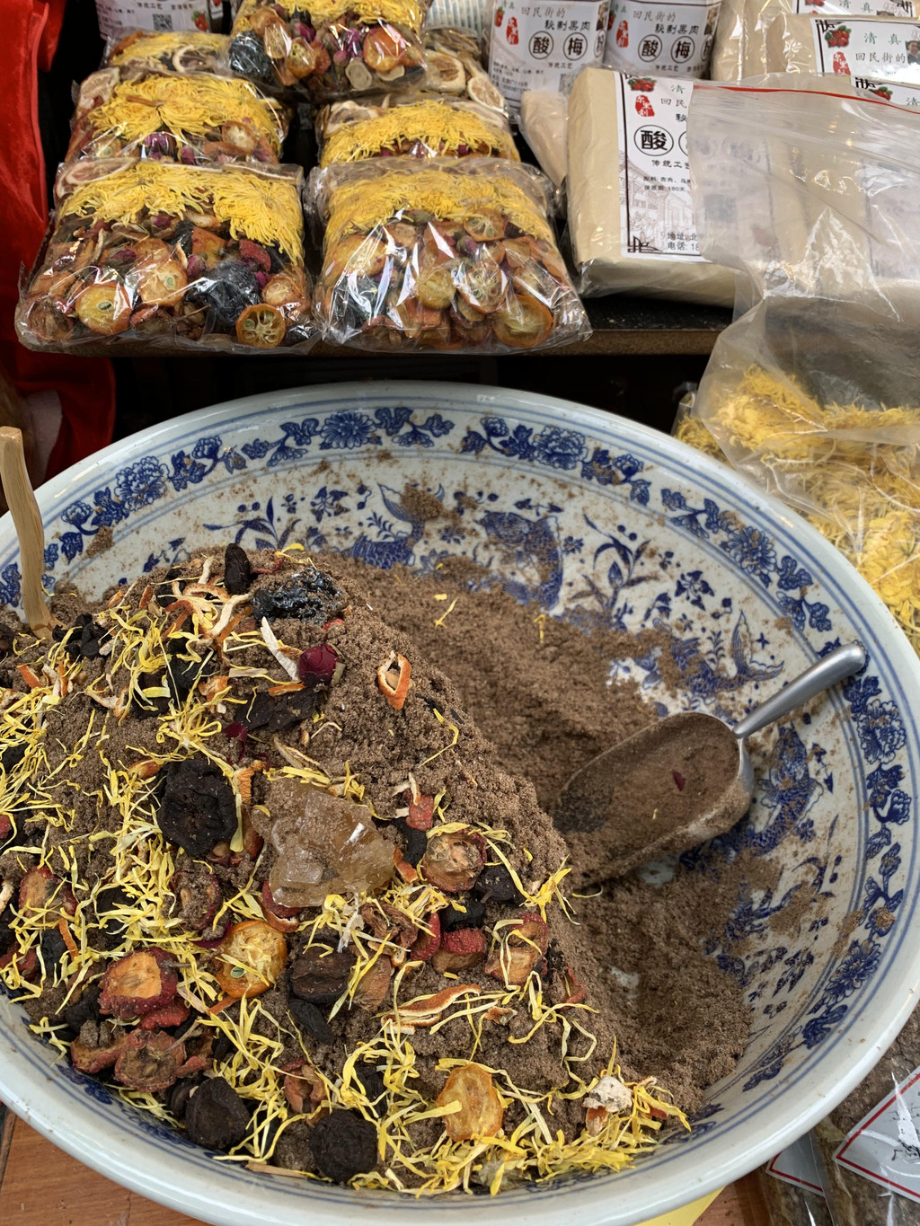 这一片老街区都差不多,石砖铺就的道路,老旧房屋,各种各样的店面,卖的东西也差不多,相比之下回民街游客更多,商业气息更浓厚。买了些酸梅粉,西安的酸梅粉值得一提,在那边喝的酸梅汤特别好喝,散装的酸梅粉五颜六色,味道浓郁,格外吸引人,买了几袋,因为都是游客聚集的地方,也没有太大期待,没想到回来后冲水太惊艳了,完胜其他地方的酸梅粉。