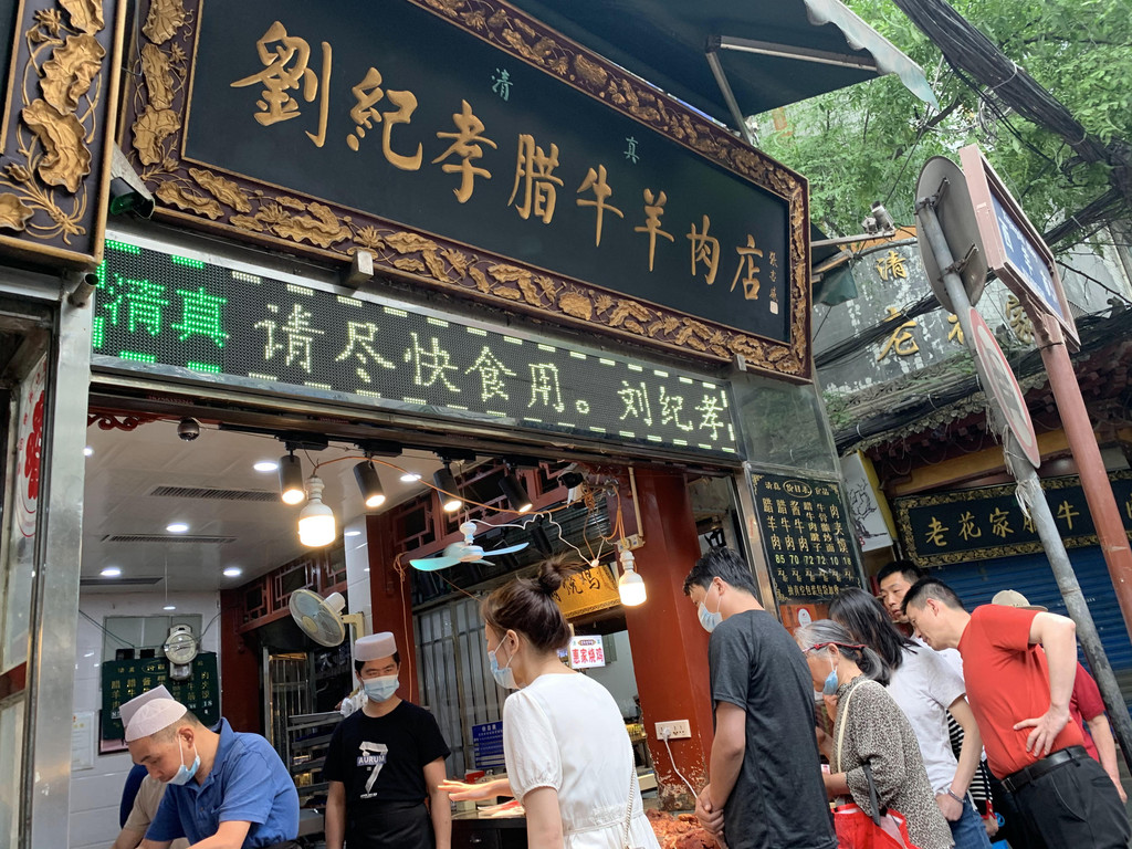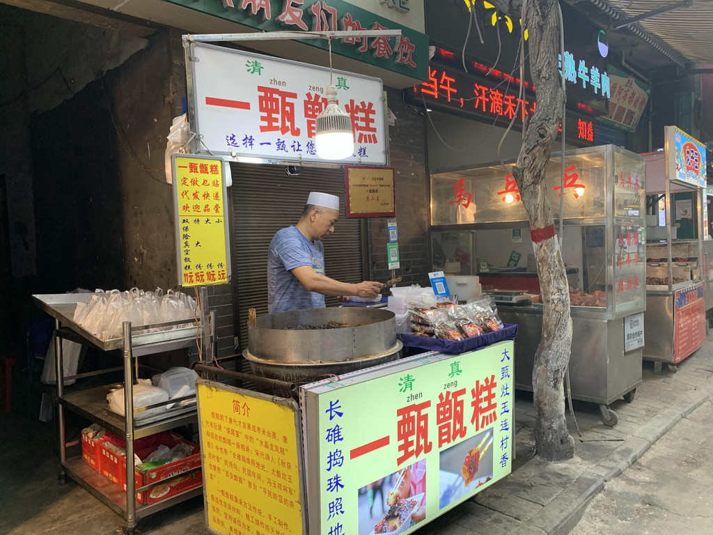返回洒金桥,收拾好东西退房出来,在路边买了些红豆糕,薄皮大馅,咬一口是浓郁的红豆香味,那种煮烂又炒过的,过去的老味道,顺便问卖糕的老人哪家的泡馍好吃,老人说他们都是吃景德泡馍,还特地嘱咐我们两个人要一碗就行。原来景德泡馍就在我们住的附近,三分钟走到。