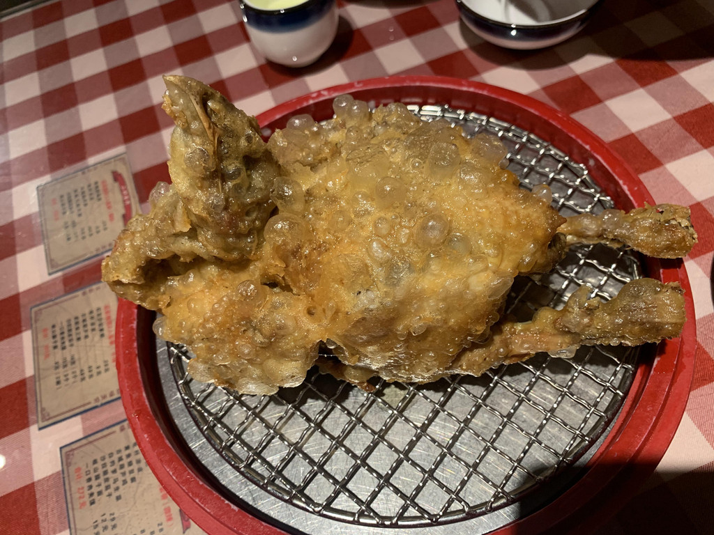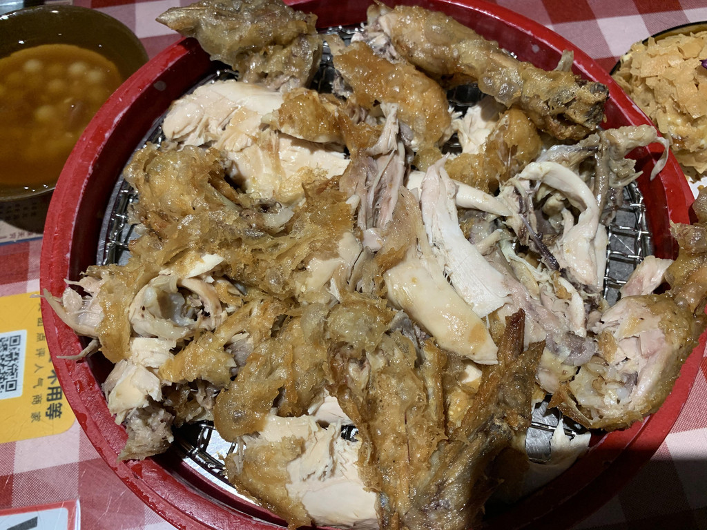 菜品非常惊艳,尤其是葫芦鸡和沙拉脆皮茄子,葫芦鸡装在一只大葫芦里面,不是很大,服务员帮我们分割开来,鸡外皮是炸过的,裹着不知道什么粉,一口下去酥酥脆脆,太好吃了,里面的鸡肉非常细嫩,两个人一丝都没有剩下;沙拉脆皮茄子也是网红推荐的,如果不是事先知道,根本看不出是茄子,酸甜咸多种口味加沙拉酱非常解腻,有点后悔没有多要两个,这个强烈推荐,其他地方好像没有这样的吃法。现在两个人都庆幸没有走,果然等待是值得的。后来在洒金桥喝茶的时候听他们讲当地从来没有人去这里吃饭,不管是不是正宗陕西菜,总归不是徒有虚名。