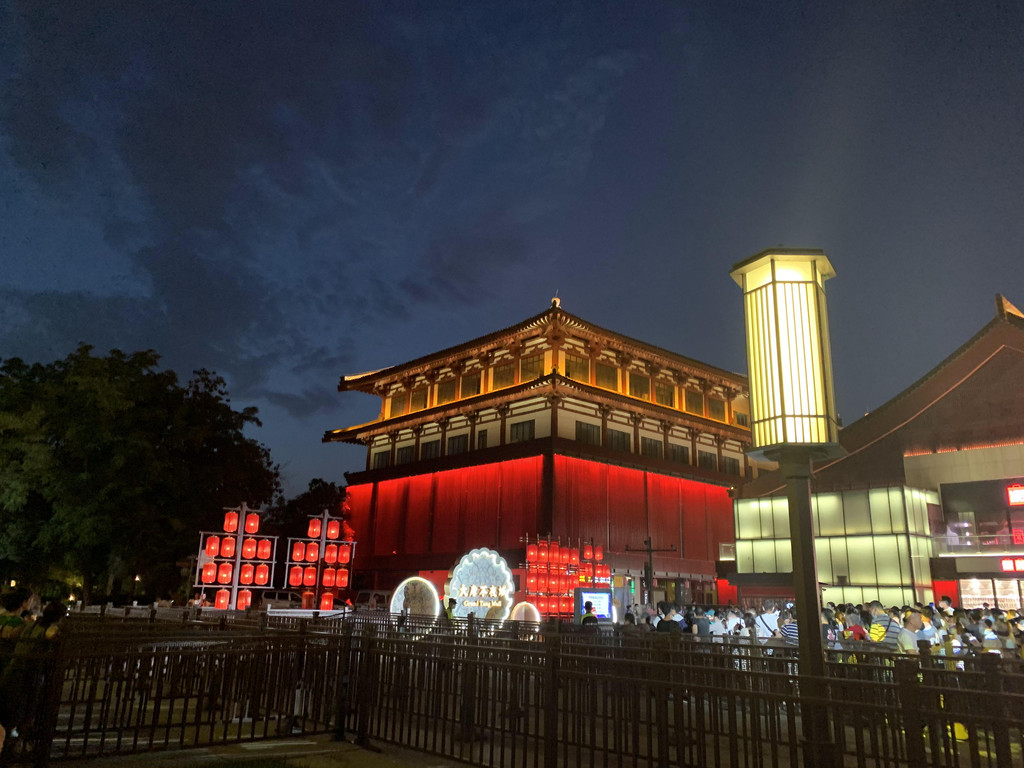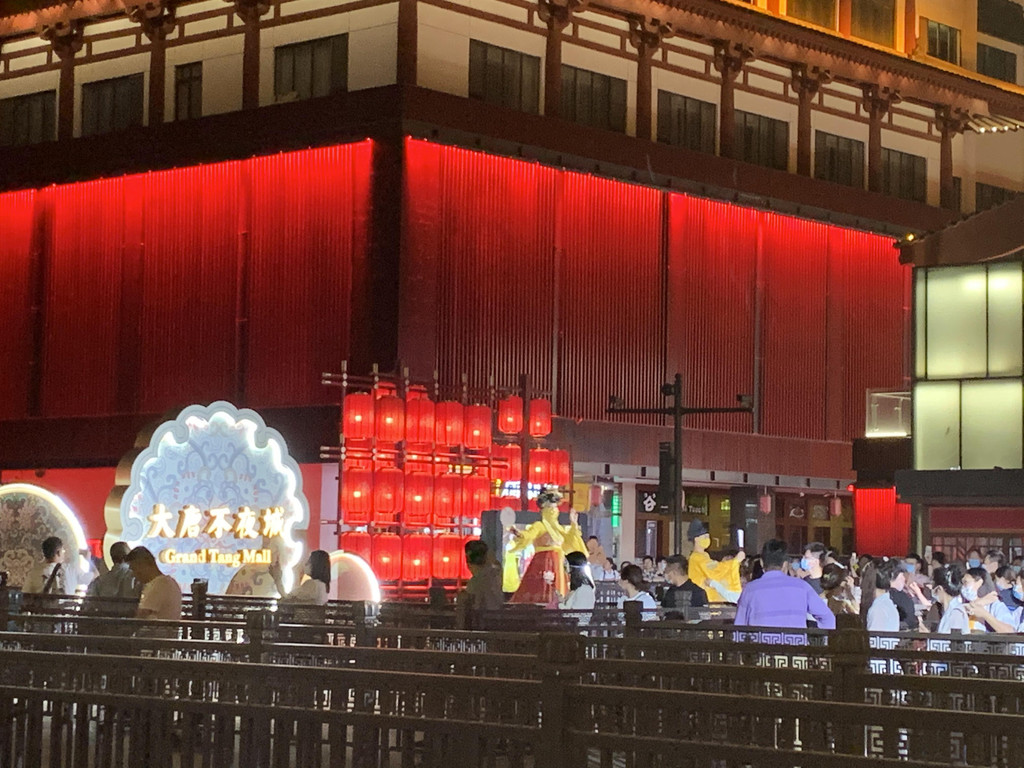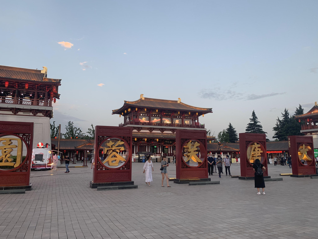 网红的不倒翁小姐姐表演就在喷泉西侧的牌坊下面,这里要提醒大家一下,不倒翁小姐姐不在大唐芙蓉园,就在大雁塔北广场,这边叫做大唐不夜城,一定不要搞混了。大概晚上9点左右才开始表演,趁这个空隙,我们打算去大唐芙蓉园看看。