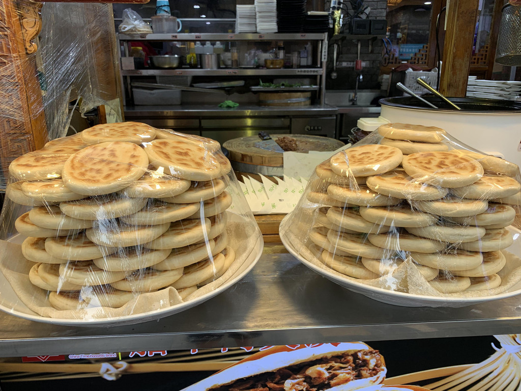 第二天一大早,混在当地人中在街边吃了肉丸糊辣汤,西安的糊辣汤与普通我们认知的河南胡辣汤不一样,里面有大量的卷心菜、胡萝卜、菜花等蔬菜,泡馍吃营养非常丰富,西安的馍口感不硬但又非常有嚼劲,一口下去有浓浓的麦香,让人停不下来,9元钱解决两个人的早餐,又买了两个馍,但实际上带回去就失去了原来的味道,南橘北枳,跟普通的饼没有什么区别了。