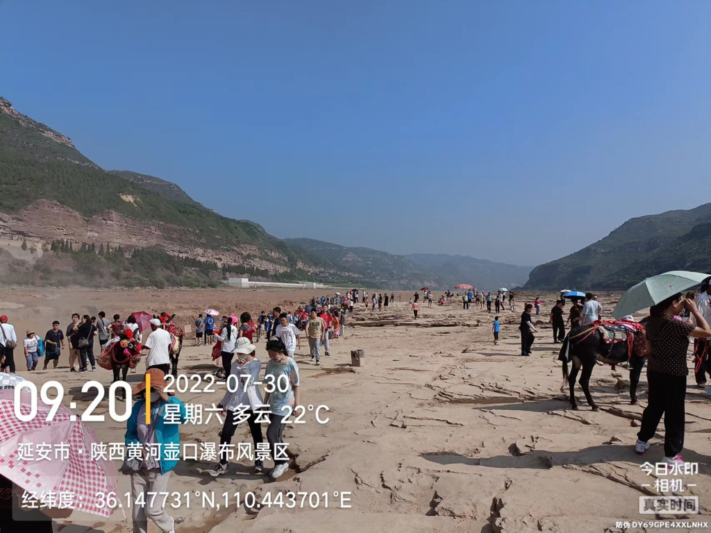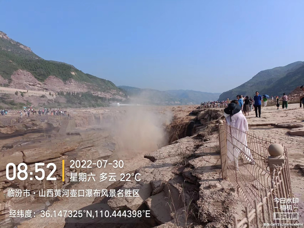 第7天,7月30日,起床后下楼吃早餐,很丰盛,退房后直奔壶口瀑布,导航提示掉头赶往游客中心,因为以前到过壶口景区,路比较熟悉,想直接去景区买票,行驶到停车场,管理员不让自驾车辆进入,说要回到5公里外的游客服务中心,购买门票100元、摆渡车40元,统一乘车到达景区专用停车场,再步行至中心景区。直接掉头行驶至通往山西景区的便桥时,看到有些车辆进入山西吉县景区,便跟随前往进入山西壶口景区,随后购票乘坐摆渡车到了山西壶口瀑布中心区,看到山西这边参观的人数明显多于陕西景区的人数,而且从山西壶口景区观看瀑布,恰逢汛期,黄河水流量增大,更能感觉气势宏伟之势,如果愿意花20元进入龙洞,可以体验“黄河之水天上来”的感觉。