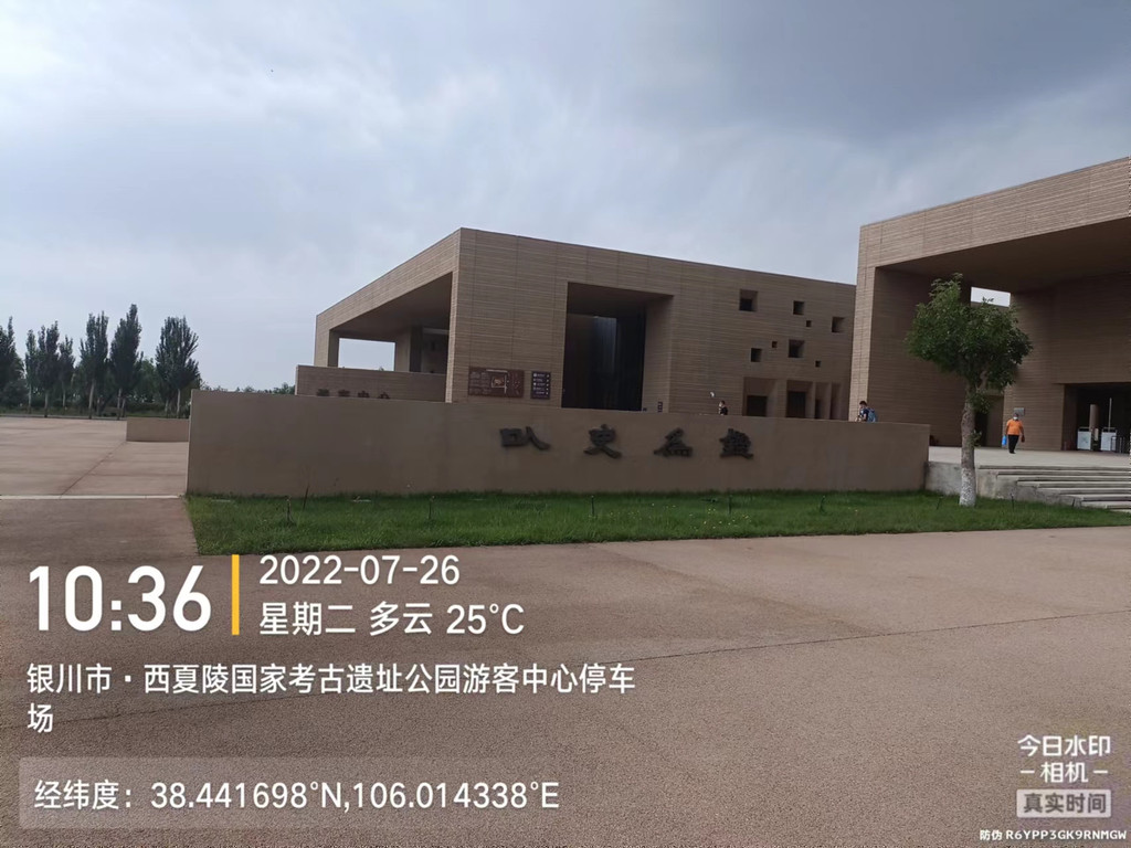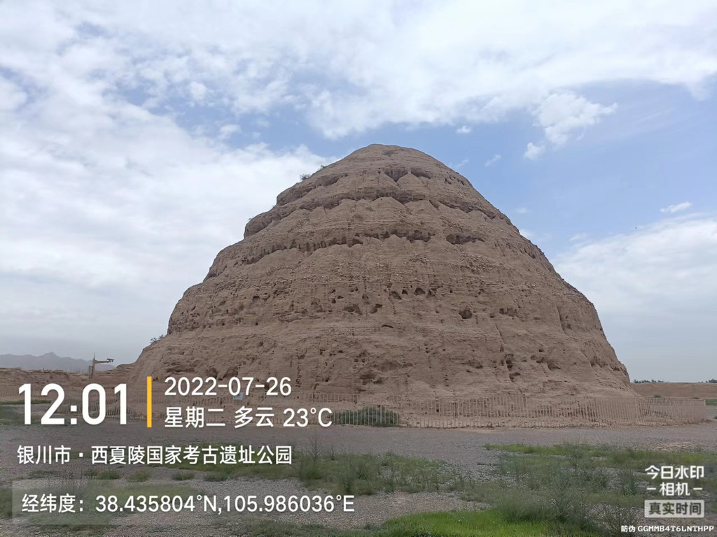 第三天,7月26日,酒店吃过早餐,直奔银川西夏王陵景区,距离较近,高速路上车辆较少,沿途是毛乌素里沙漠与草原的过渡地段,偶尔出现的炼油厂或煤炭开采区高耸的烟囱显得很突兀,不由得想起了唐代大诗人王维在《使至塞上》留下千古流传的名句 “大漠孤烟直,长河落日圆”。全程2个小时从高速银川北收费站出到了西夏王陵停车场,景区很大,面积20.9平方公里,分布9座帝王陵墓,先是参观了西夏王国的发展、辉煌及没落史,党项族首领李元昊建立西夏,蒙古人灭了西夏国,印象较深的西夏国创立的文字。然后乘观光车前往陵区,很多陵塚,像个馒头,大大小小很多,代表了地位的高低,泰陵最大,位于西夏博物馆西南,游客可下车参观,保留较完整,规模较大的一座王陵,