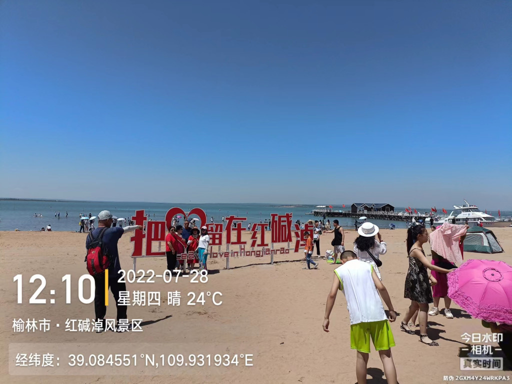 从游客中心出来,赶往下一个打卡点-红碱淖,红碱淖位于神木市,处于黄土高原与内蒙古高原过渡地带、毛乌素沙漠与鄂尔多斯盆地交汇处,导航显示最近距离40分钟,走村道即可,鄂尔多斯市与榆林市地带相连,沿途无检查站,2017年曾到榆林市时因故未能游玩,有水有沙丘,需乘坐快艇前往,主要是带小孩游玩的较多,景区很小,不去沙丘的话40分钟结束。游玩红碱淖,直奔携程提前预定的榆林市鹏达酒店298元,大约行驶2个多小时。