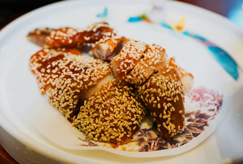 芝麻吊烧鸡是一道广东的地方传统名菜,属于粤菜。以鸡肉为主要食材的私家菜,鸡肉皮脆,肉鲜,骨香,口味咸鲜,色泽红亮,皮酥肉嫩,味道鲜美。