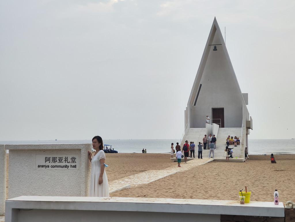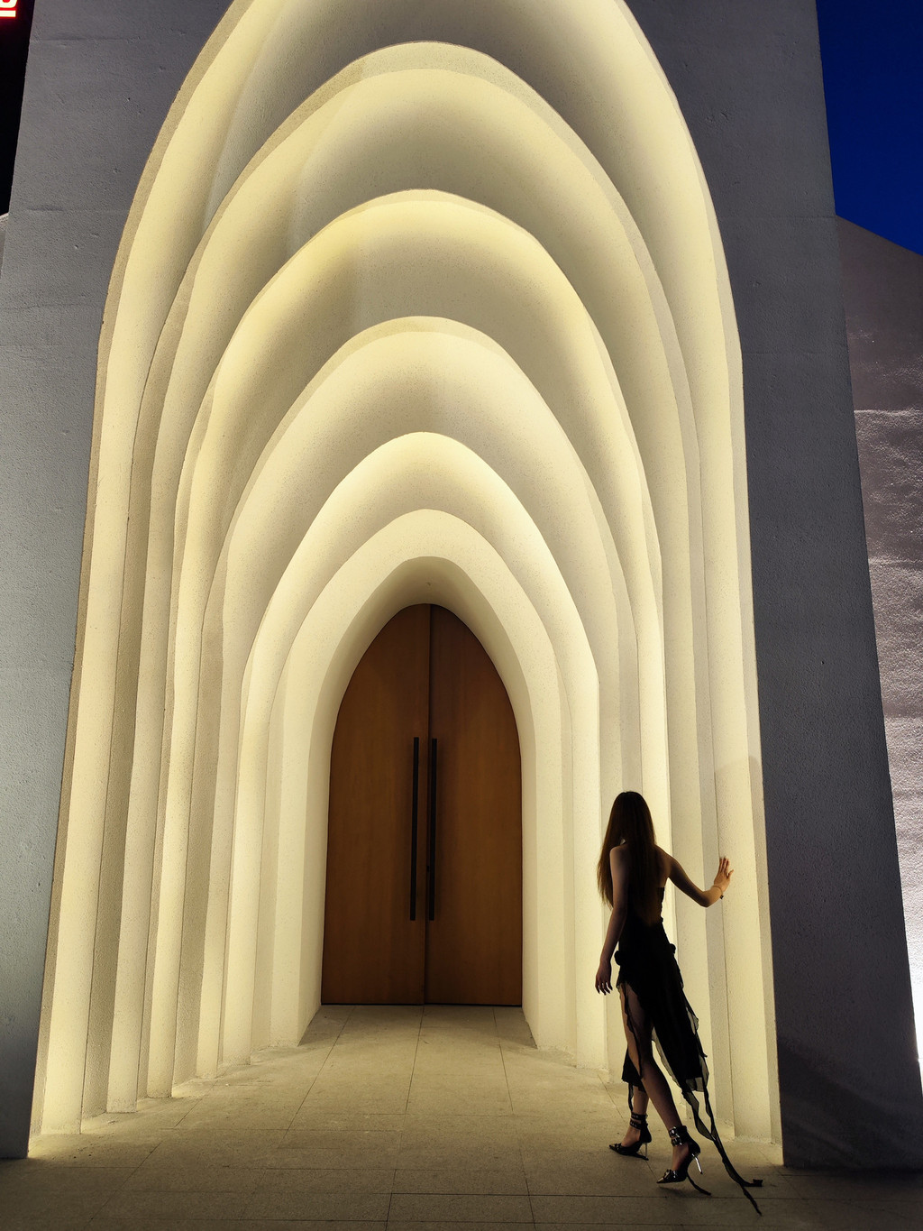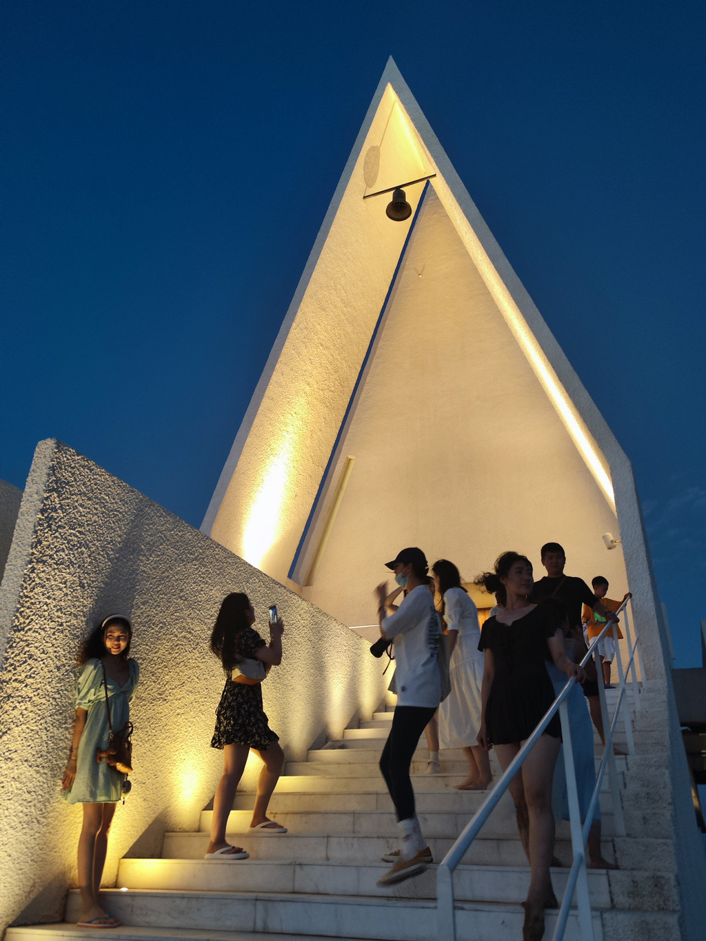 整个礼堂采用简洁的灰白色调,高达13米的造型使内部空旷神秘,格外适合拍照。由于其造型和名字与著名网红打卡地阿那亚礼堂极为相似,因此一问世就受到不少争议。我拍摄了阿那亚礼堂和阿纳加艺术礼堂的许多照片,希望读者能评判两者的差异。