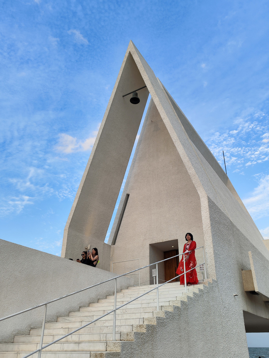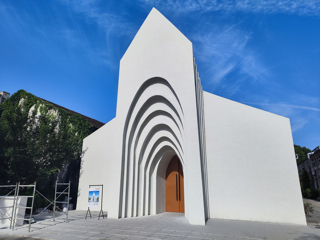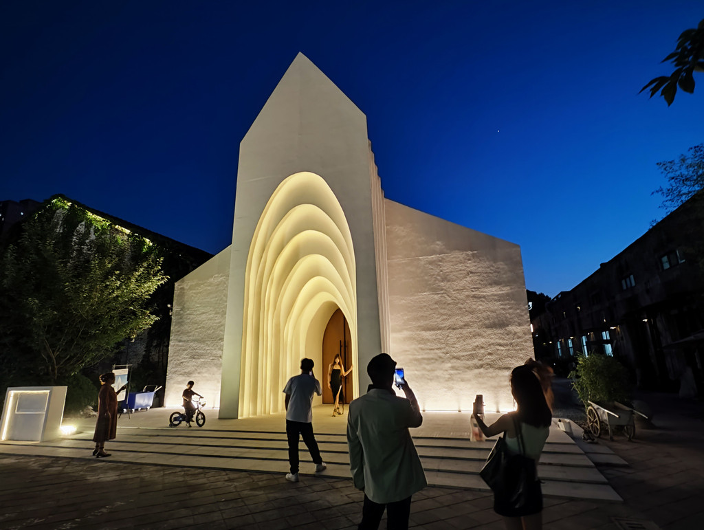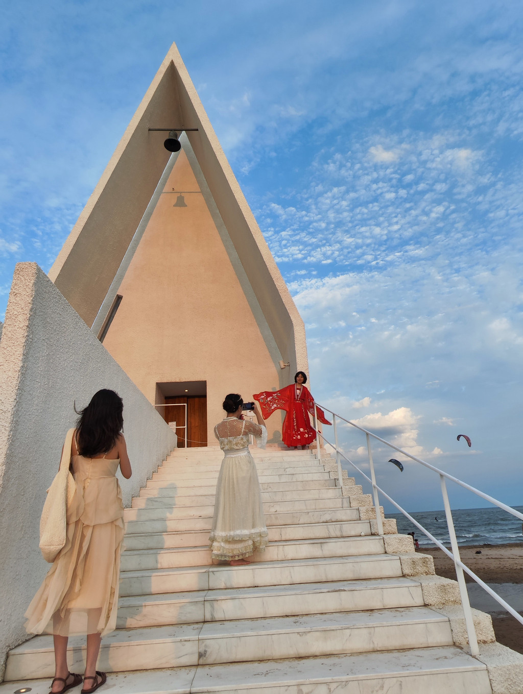 整个礼堂采用简洁的灰白色调,高达13米的造型使内部空旷神秘,格外适合拍照。由于其造型和名字与著名网红打卡地阿那亚礼堂极为相似,因此一问世就受到不少争议。我拍摄了阿那亚礼堂和阿纳加艺术礼堂的许多照片,希望读者能评判两者的差异。