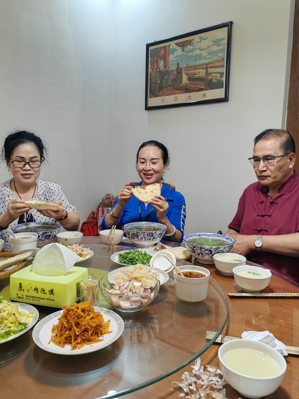 早餐是美女老友早早地在酒店订好了的,酒店距家不远,步行几分钟来到包间落座,很快特色饭菜就上来了,是蒲城的驴肉水盆泡馍。不由让我们想起那首《西安人的歌》中的词句,“西安人到哪,都不能不吃泡馍”。而这款泡馍,却是我在西安没有看见的,汤鲜瘦肉大块咥,墩子红油月牙饼,真是色香味美唇齿留香,那么大一碗驴肉汤泡馍,居然还有喝个干净实属爽快,感受到那种快意人生的意味。