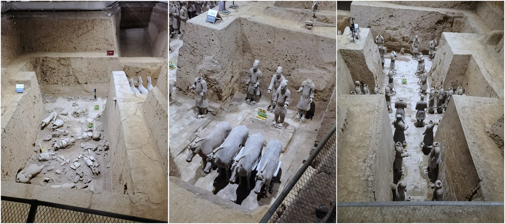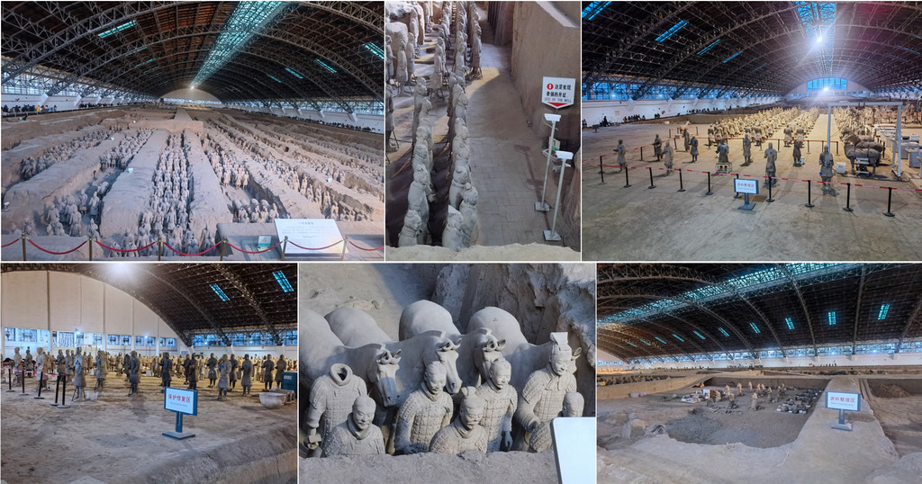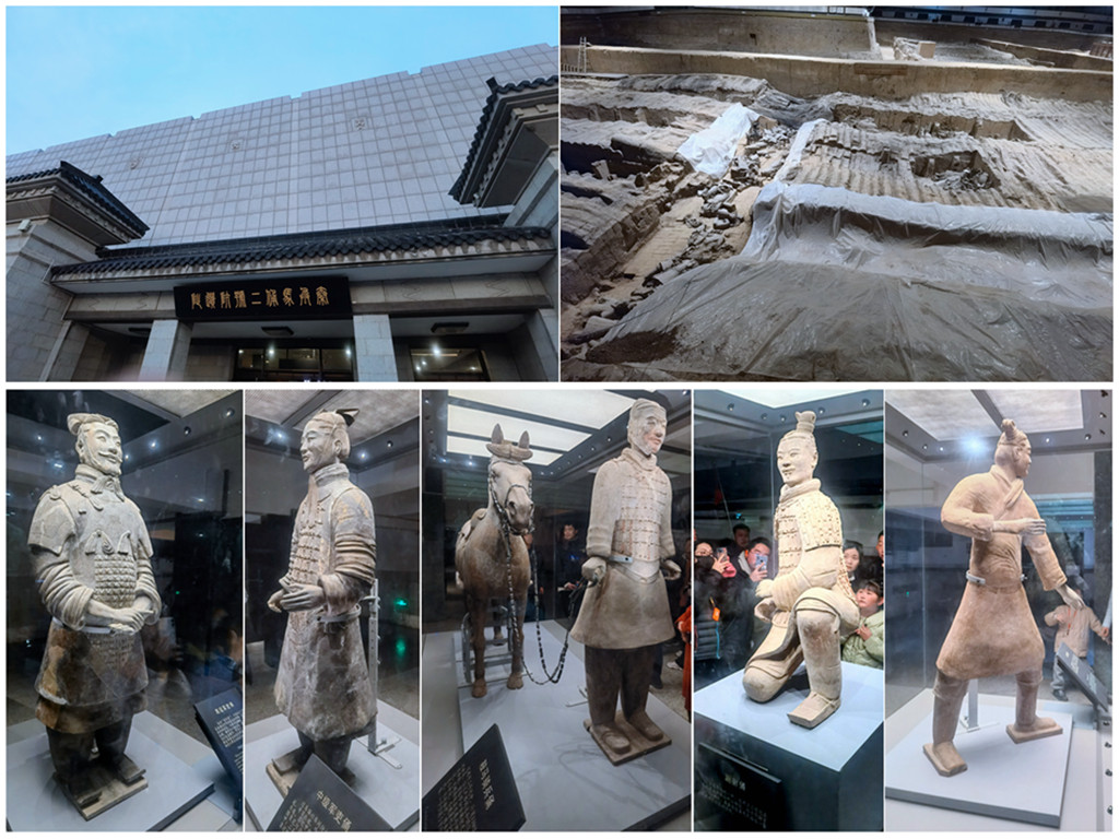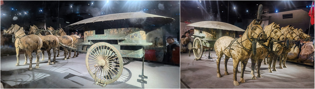 铜车马坑遗址——出土彩绘铜车2乘,驾马各 4 匹,铜御官俑各 1 件,车、人、马均为实物的 1/2 大小,被誉为“青铜之冠”,实际展品一复制一原件,秦国精细手办令人叹为观止。