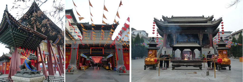 没找到通往都城隍庙的小路,只能经大学习巷绕道到西大街从大门进入,高大的牌楼威风的狮子,穿过红旗飘飘的商业街,先见财神殿,然后再到广场,回首见戏台,尽头是城隍的庙宇。吸引我去的不是因为这里是最高等级别的城隍庙,而是牌坊上的风趣语录。