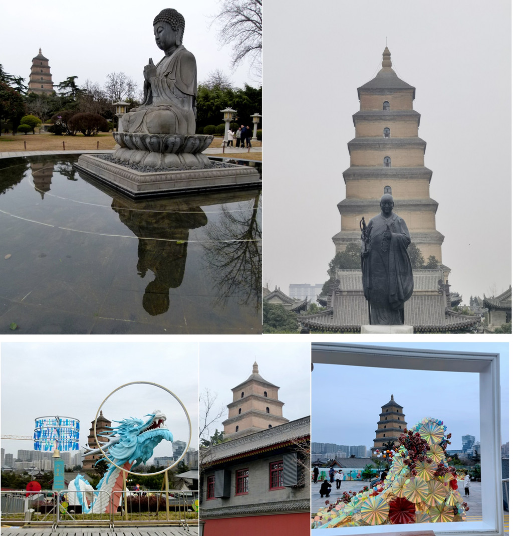 找公交车途中看到好多旅行社从北院门进入回民街,到大雁塔南广场的公交车上也挤满人。下车往回走,先去唐大慈恩寺遗址公园找如来佛拍倒影以及大雁塔的合照,然后再回南广场拍鉴真雕像和大雁塔的合影,接下来在大雁塔西侧找到大悦城3号门,在红墙边打卡后,乘直梯到观光平台继续拍照。除了南广场人超多,其他几个点位略等个十来分钟都能拍上,大家挺有序的会排队。还有一些点位如咖啡店的平台、停车场平台之类我就没有去。完成打卡拍照,下去发现大慈恩寺排队队伍已经快到牡丹亭了,此时到处是浩浩荡荡的人群,所幸广场面积大,不算拥挤。