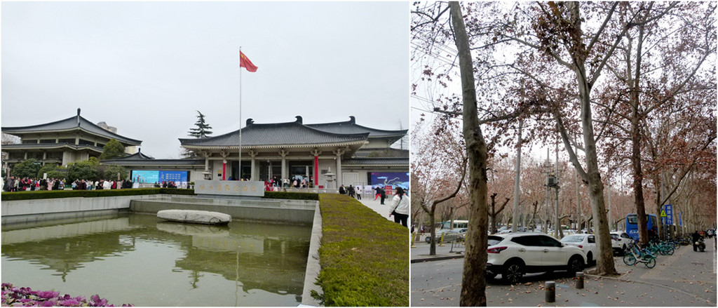 好不容易看完,湿漉漉的我好不容易找到厕所收拾好,找不到小蓝车,只好继续公交车1站到陕历博。很可惜没有抢到博物馆的门票,拍个照慰藉一下,有谁能告诉我为啥西安街上法国梧桐还能有那么多枯叶留存?