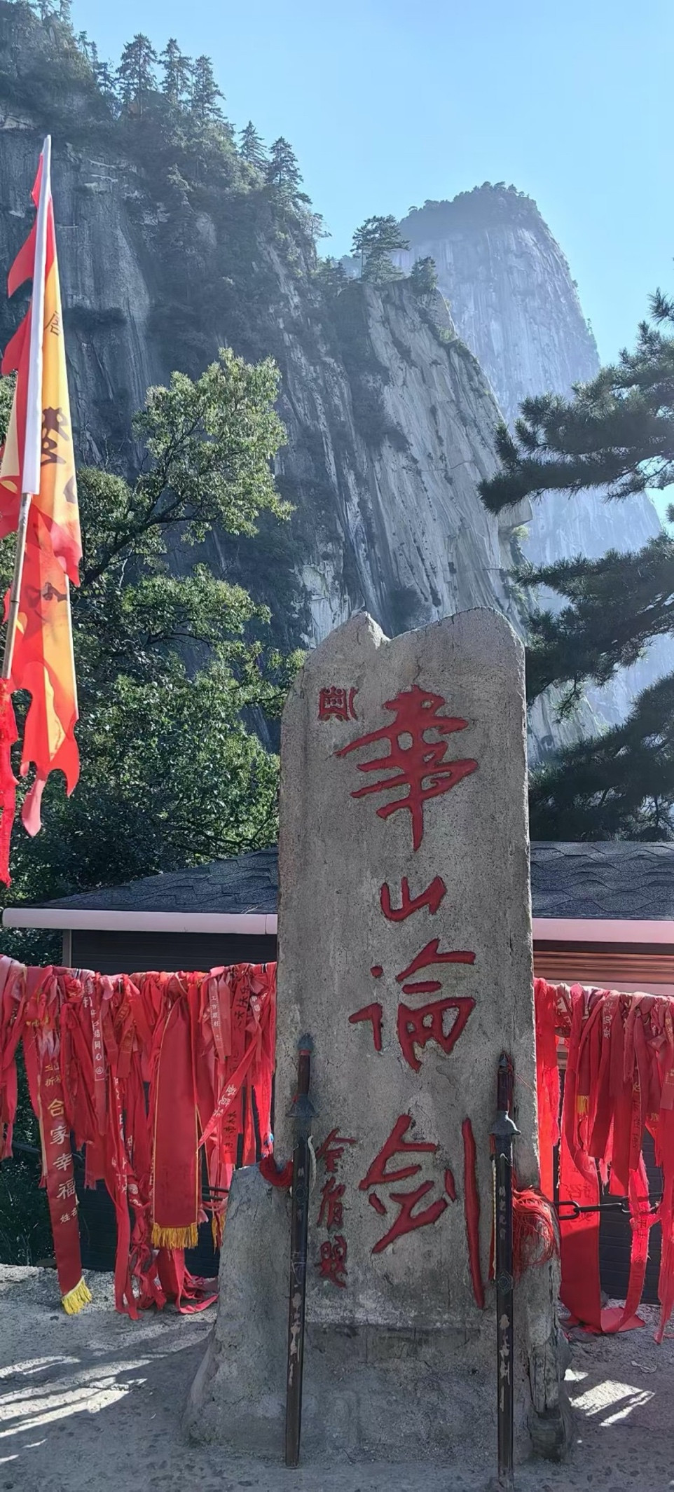 直接开车去的华山。先排西上大巴车(要排两轮,排内场和排大巴,约1小时),进山大巴50分钟左右到西锋山脚底,这边也有小卖部,可以买些吃的喝的,或者直接吃完再上山,因为山上东西都比较贵,我们是直接炫掉汉堡,吃了香肠、玉米,吃得饱饱的,为我们的爬山旅途续足体力。