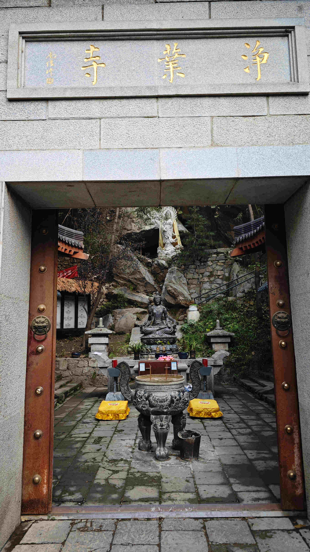 净业寺现占地面积约十亩,位于后庵山之阳的山腰,坐北面南。自南而北依次为三间过庭式天王殿,殿东侧开一偏门,院正北的大雄宝殿,面阔三间、进深二间,大殿后左、右侧有两层木楼寮房各一座。院东为斋堂五间,院西原有禅堂五间。大殿后有石洞三孔,内供观音、普贤、文殊三菩萨像,系民国时期西北军将领敬佛所凿。