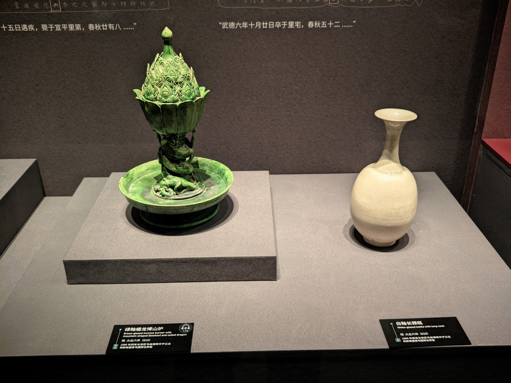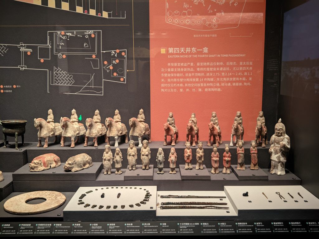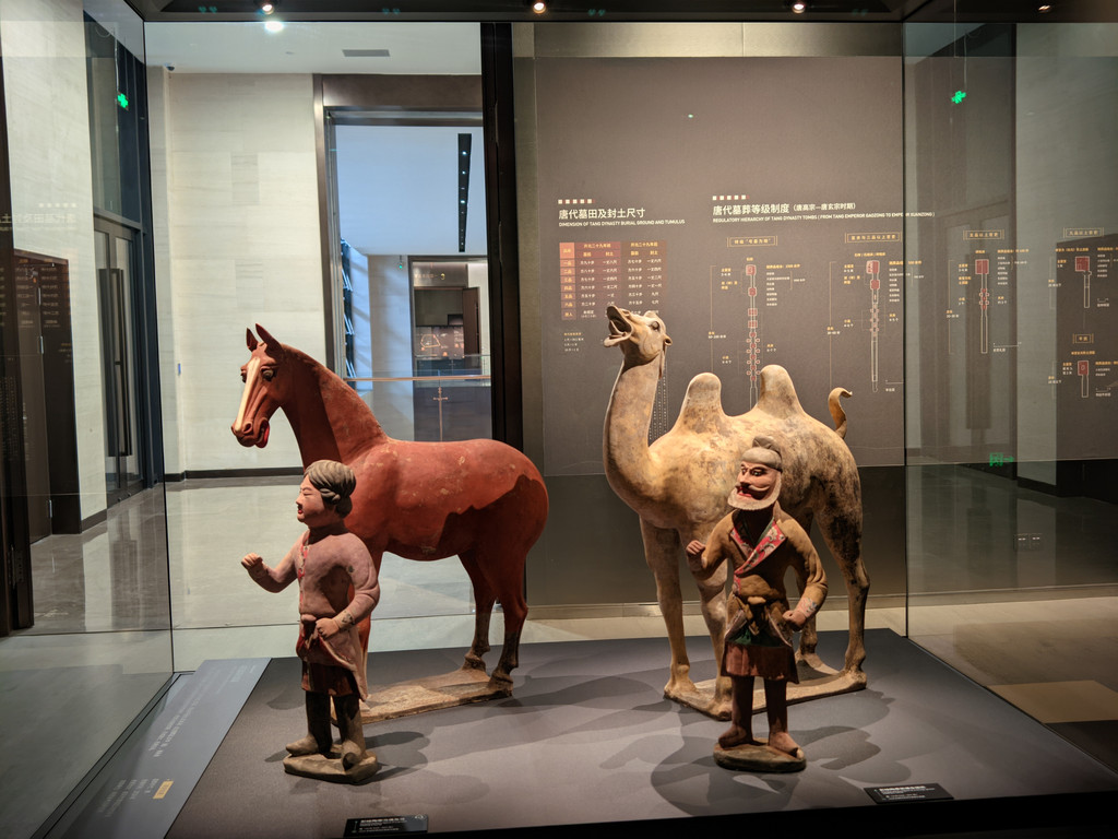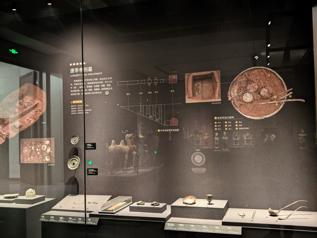 博物馆精品也是不少,如镂空人面覆盆型器、神面立柱石雕、牺尊、贺家村青铜轮牙马车、李倕冠饰、墓葬壁画、上官婉儿墓志铭等等,分布比较散。