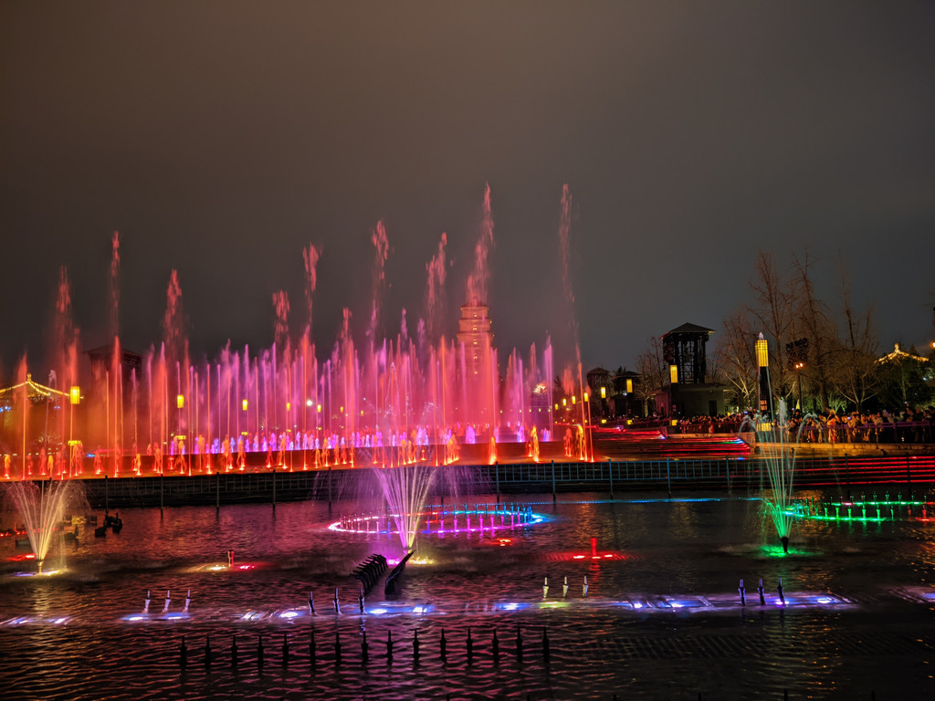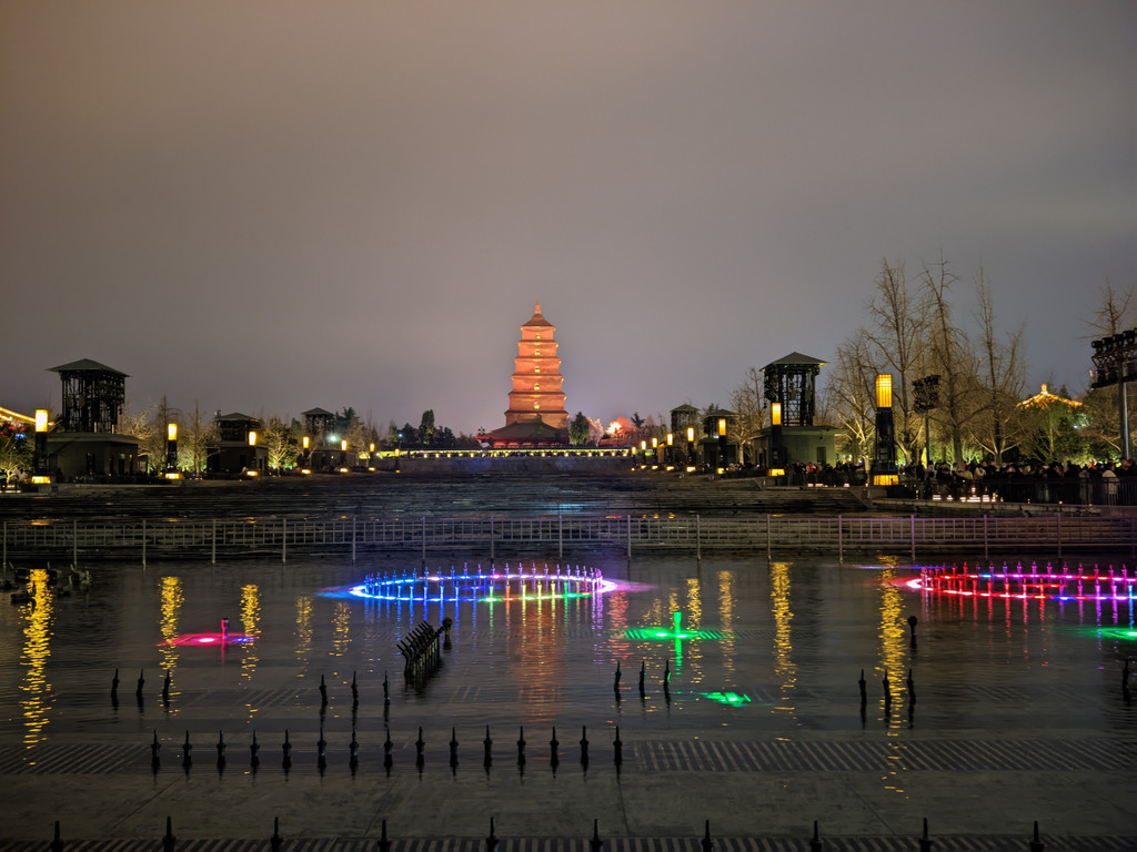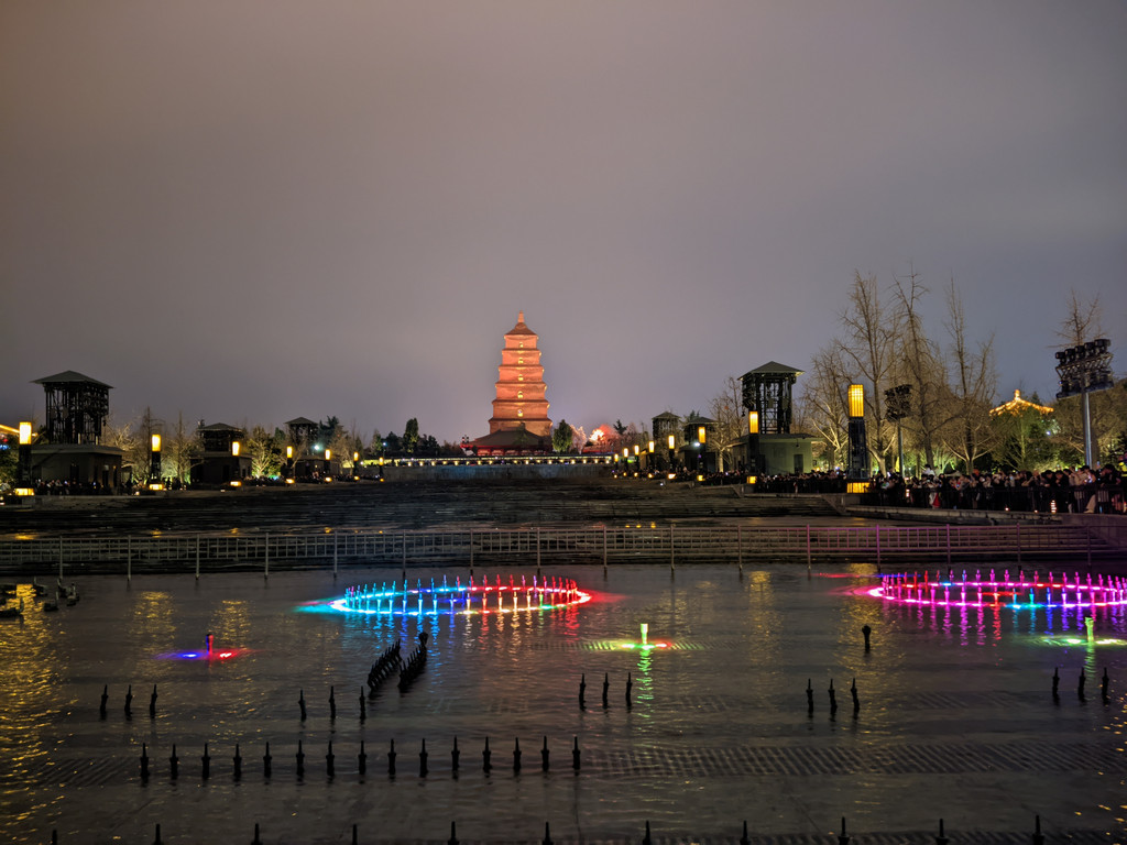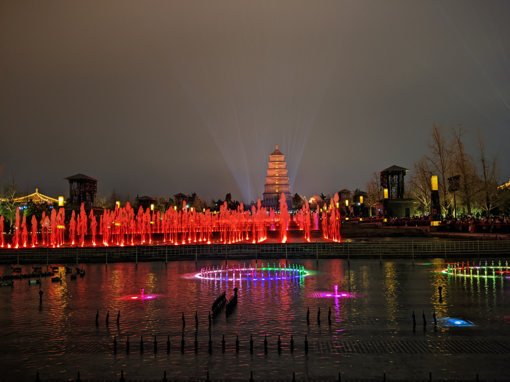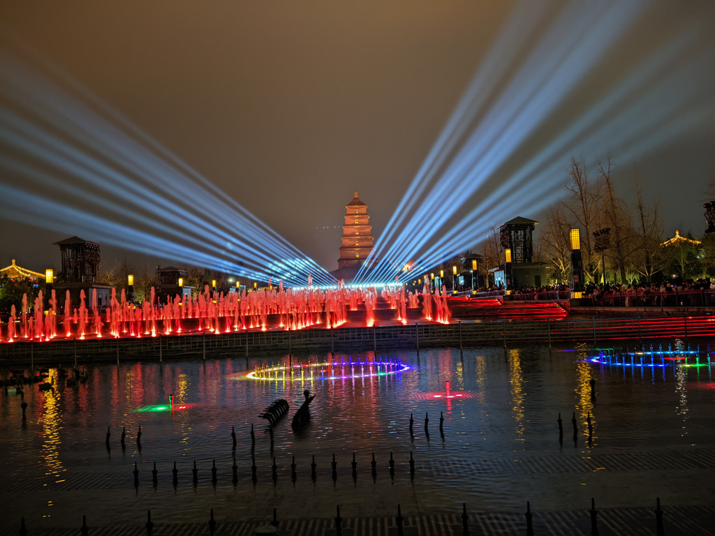 大雁塔喷泉水面面积达2万平方米,其八级迭水池中的八级变频方阵是世界最大的方阵。每级水池有7级迭水,与大雁塔7层相印合。这套喷泉共设计独立水型22种,其变频方阵(排山倒海水型)包括莲花朵朵、百米变频跑泉、云海茫茫、海鸥展翅、蝶恋花、水火雾以及60米高喷水柱等,都是中国最新推出的科技含量较高的新颖水型。