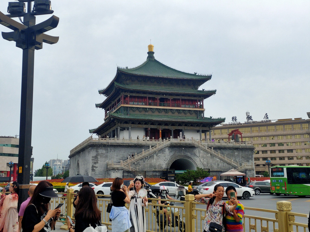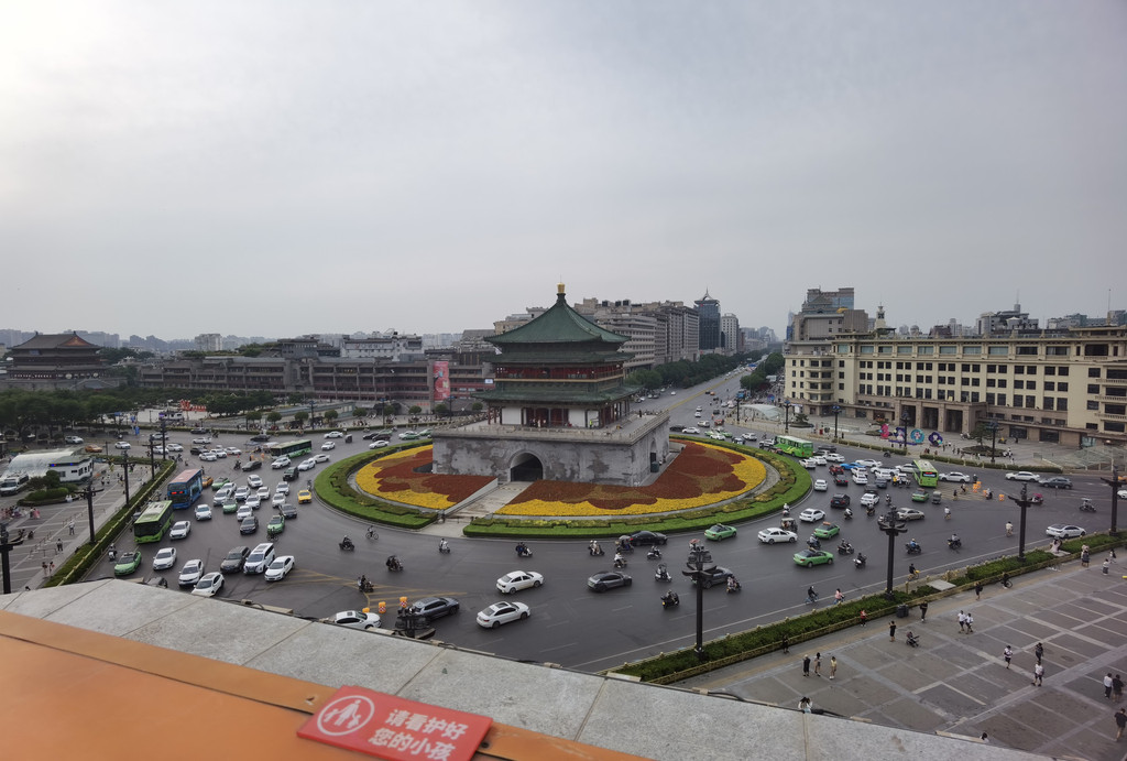 接下来的行程就是回到钟楼,在西安古城区,钟楼就是比较中心的位置,在这到哪里都很方便,我们住宿就选择在了钟楼的附近。钟楼现在也是古城的一个交通枢纽的位置,在旁边的开元广场,五楼有个小的观景平台,可以拍摄钟楼的全景。
