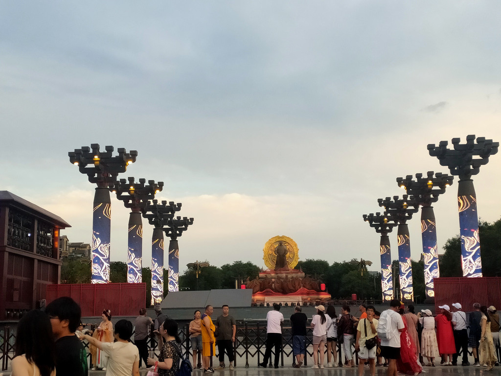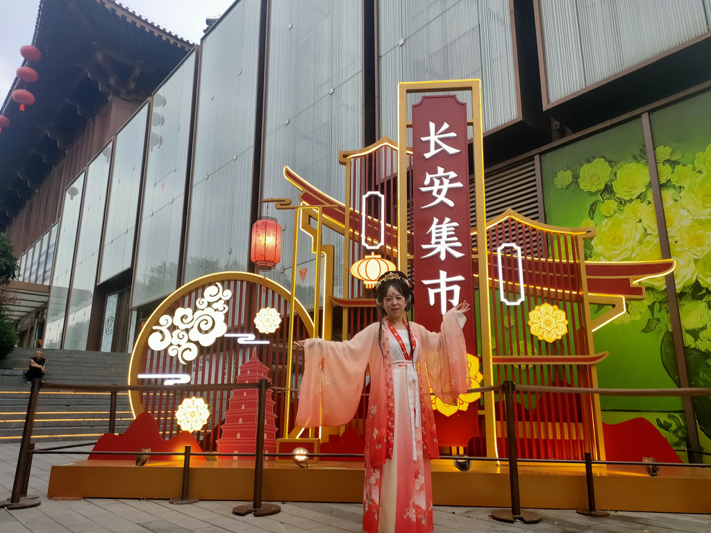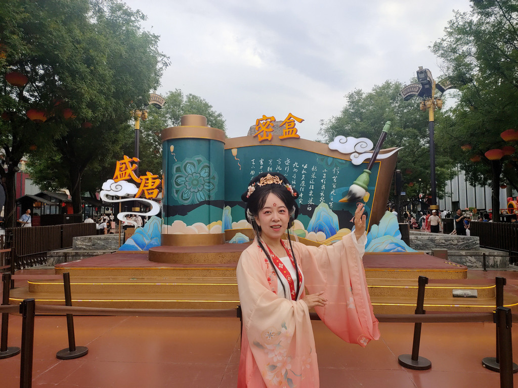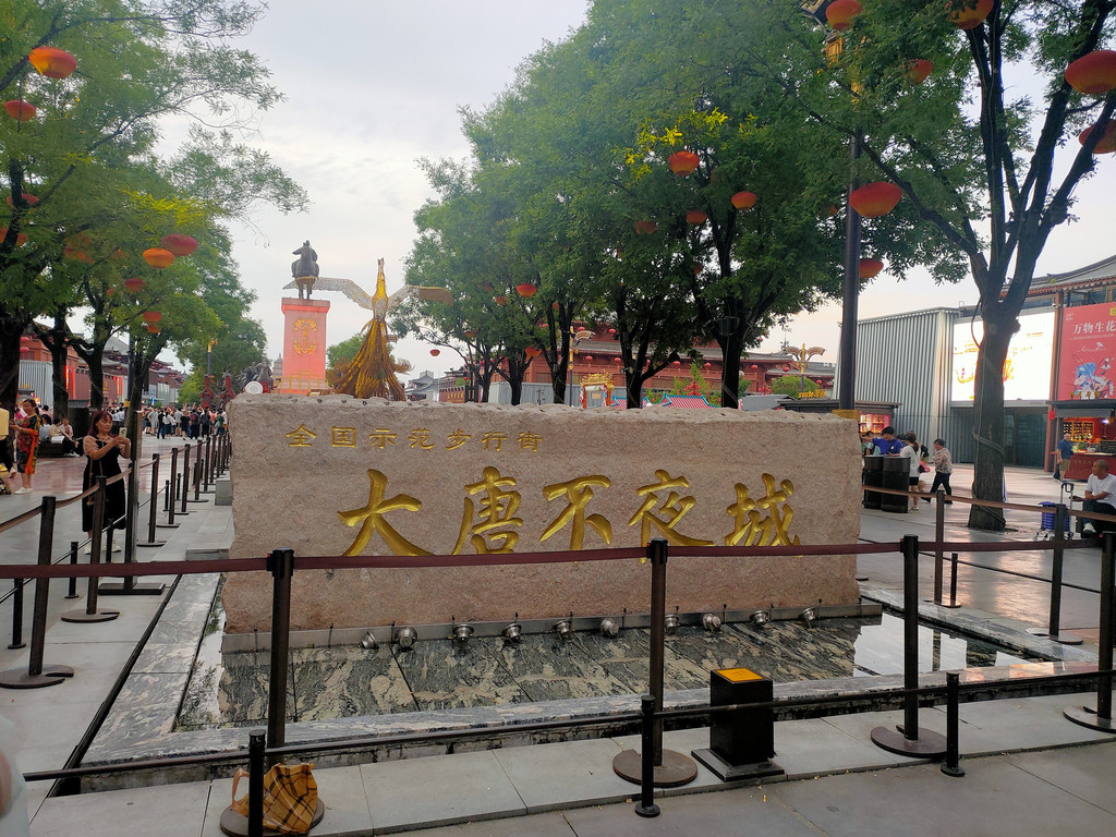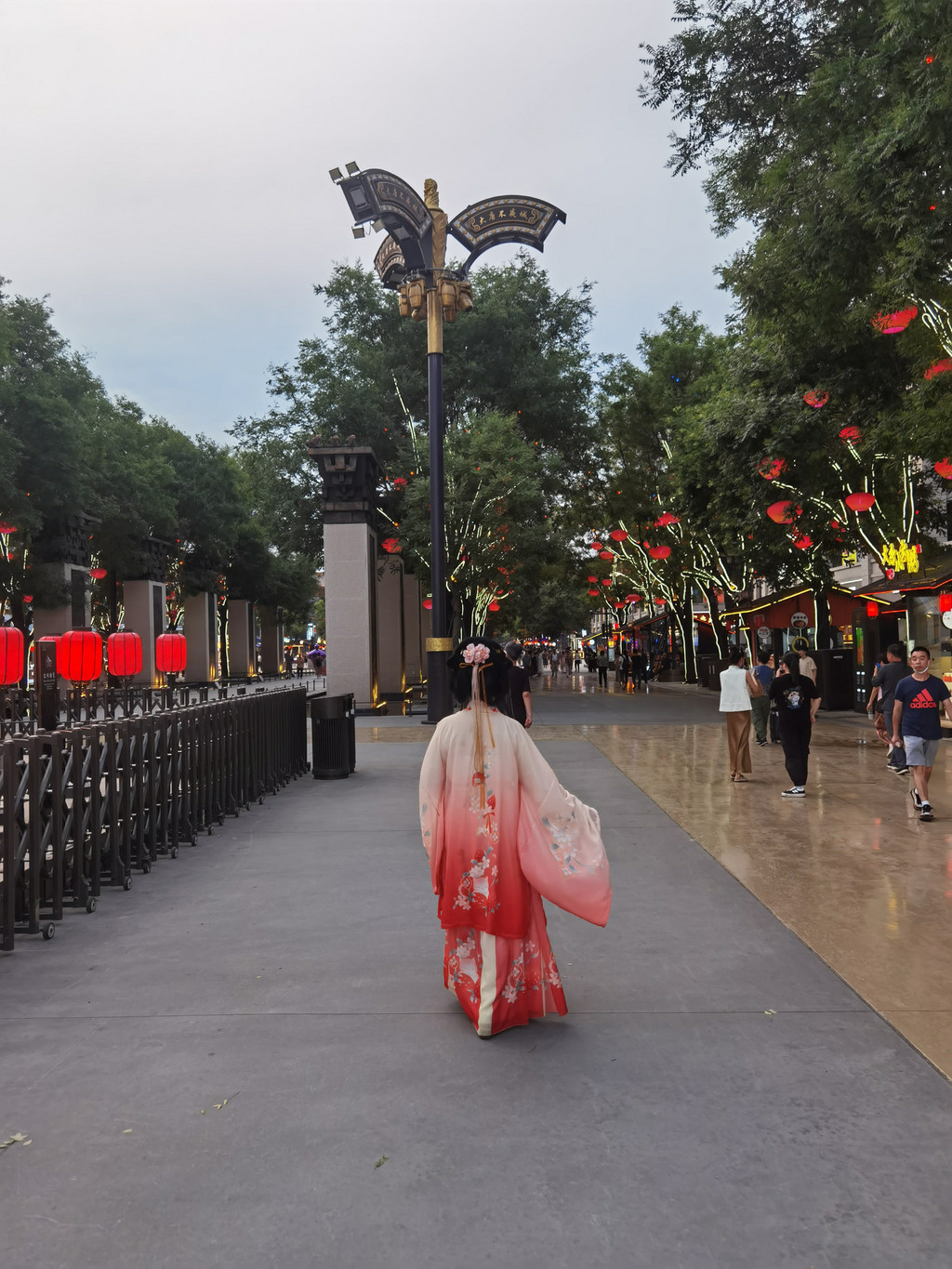 下午休整了一下,避开了高温时段,傍晚开始往大雁塔景区出发。大唐不夜城以大雁塔为依托,北起玄奘广场、南至唐城墙遗址公园、东起慈恩东路、西至慈恩西路,贯穿玄奘广场、贞观文化广场、开元庆典广场三个主题广场,大唐不夜城晚上灯火璀璨,光影中的仿古建筑流光溢彩,气势恢宏,宛如大唐盛世再现。特别多的汉服妆造店,都很好。我随便选了一家,仅花了198元,服饰和妆造都很美,带着美美的妆造在大唐不夜城逛逛。