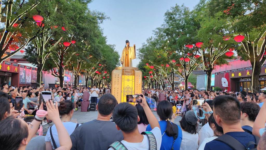 了大悦城不远就是大唐不夜城。原以为大唐不夜城是一个公园,其实它是一条经过精心打造的现代化步行街。街的中间有气派雄伟、反映当地历史人物、民俗、民情的雕塑,两边是商场、大剧院、美术馆、音乐厅和各种商铺及小吃长廊。晚上灯光闪烁,有形式多样的表演,行人如织,人们穿着唐朝样式的服饰穿梭于城内,置身其中,仿佛回到了唐朝盛世。遗憾的是天气闷热,我们只看了一部分表演就坐地铁返回酒店,感觉甚是疲劳。查看手机,当天步行达15.