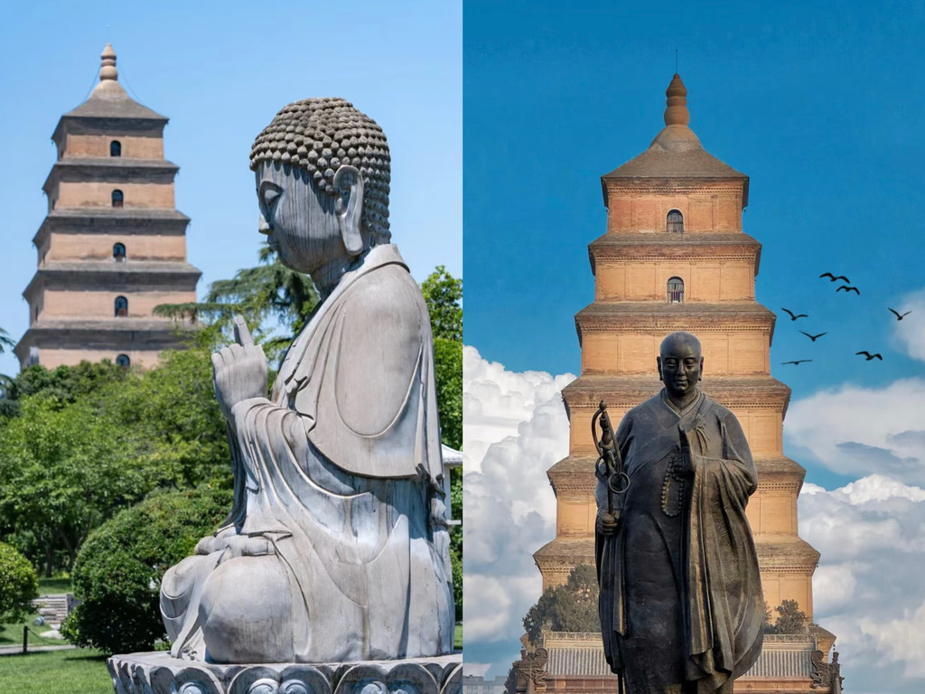 从博物馆步行10分钟就到。我们没有登塔,而是直奔大悦城4楼观景台——视角绝了!这里能免费拍到大雁塔全景,搭配蓝天白云超出片。北广场的音乐喷泉别错过,16点那场人不算多,水柱随着《长安夜》的旋律舞动,瞬间梦回大唐。