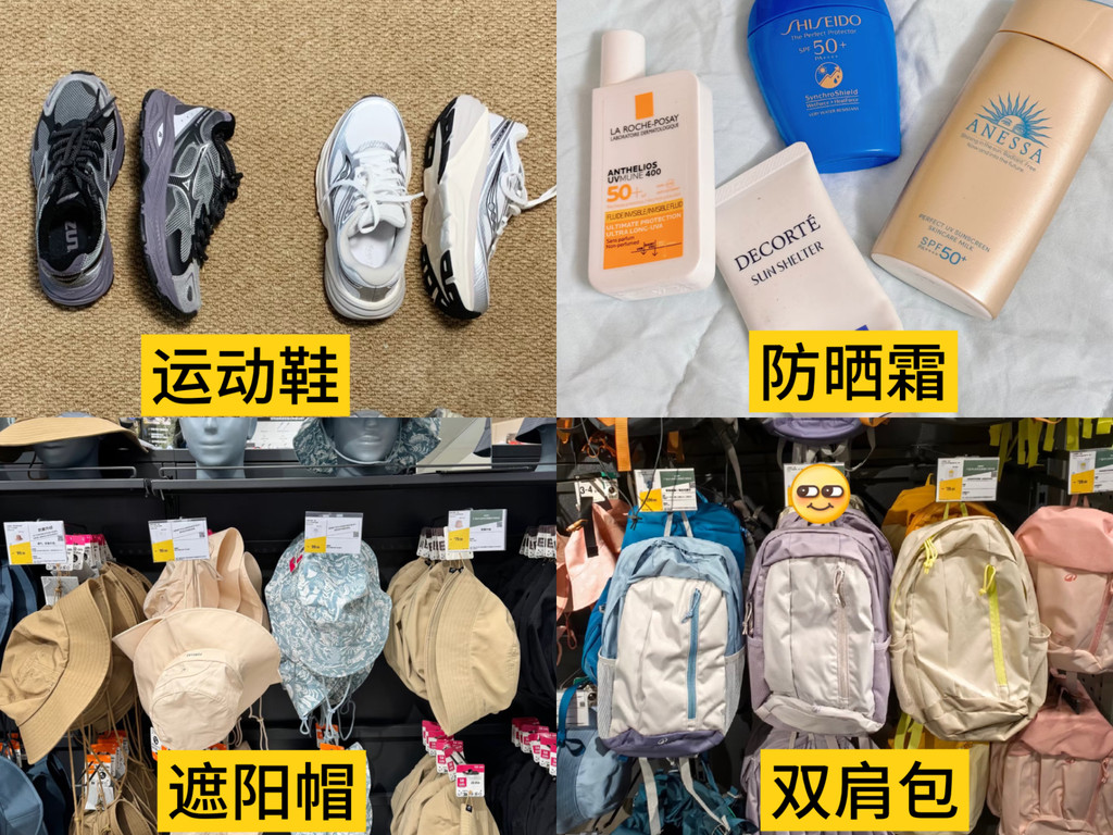 轻便的背包:装水、零食、防晒用品,逛吃的时候更方便,建议选双肩包,解放双手。