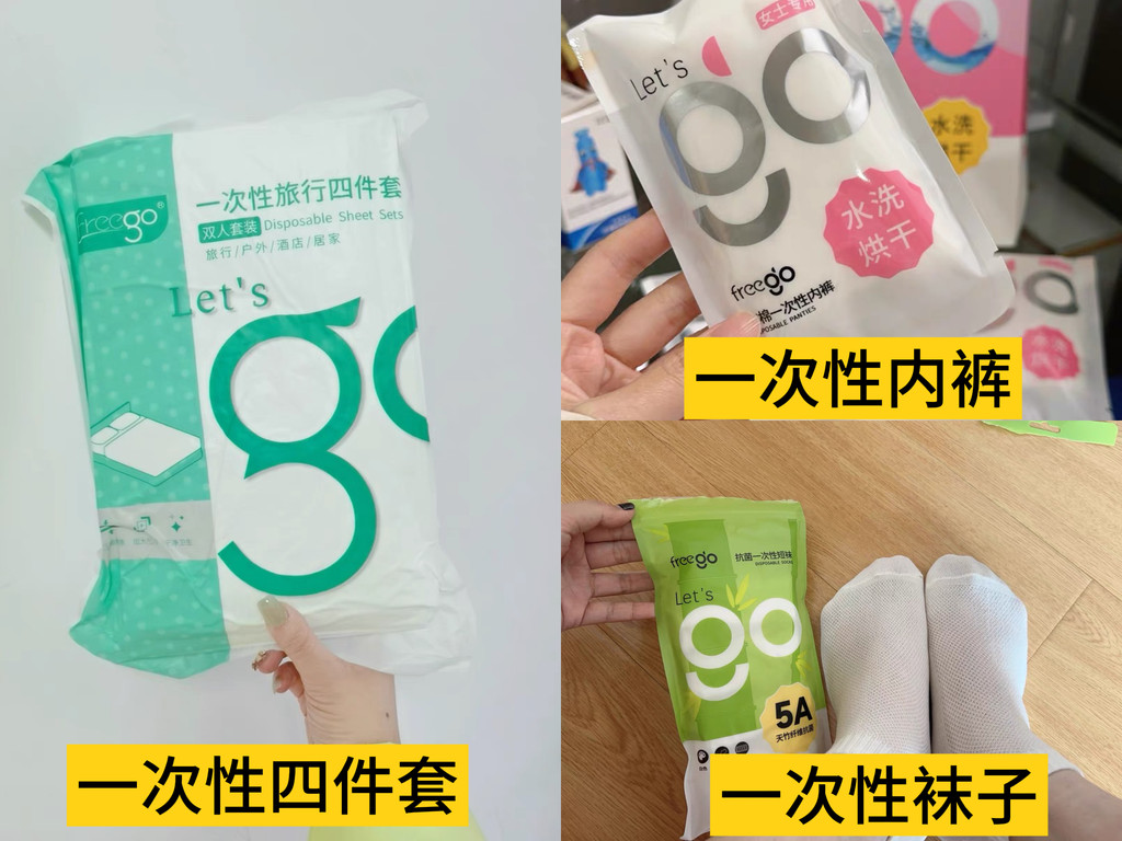 一次性出行用品:白天暴走晚上不想洗内裤、袜子,直接穿一次性的太省心;担心酒店/民宿床上不干净,用一次性四件套隔绝污渍。