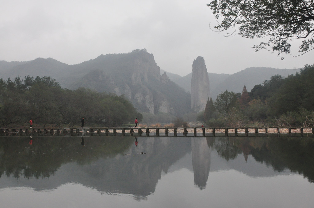独树一帜的鼎湖峰最适宜远观,尤其是在那座桥上,溪水的倒影将鼎湖峰融进湖中,山光水色,争奇斗艳,即使是阴天,水墨画的感觉也让人痴迷不已。