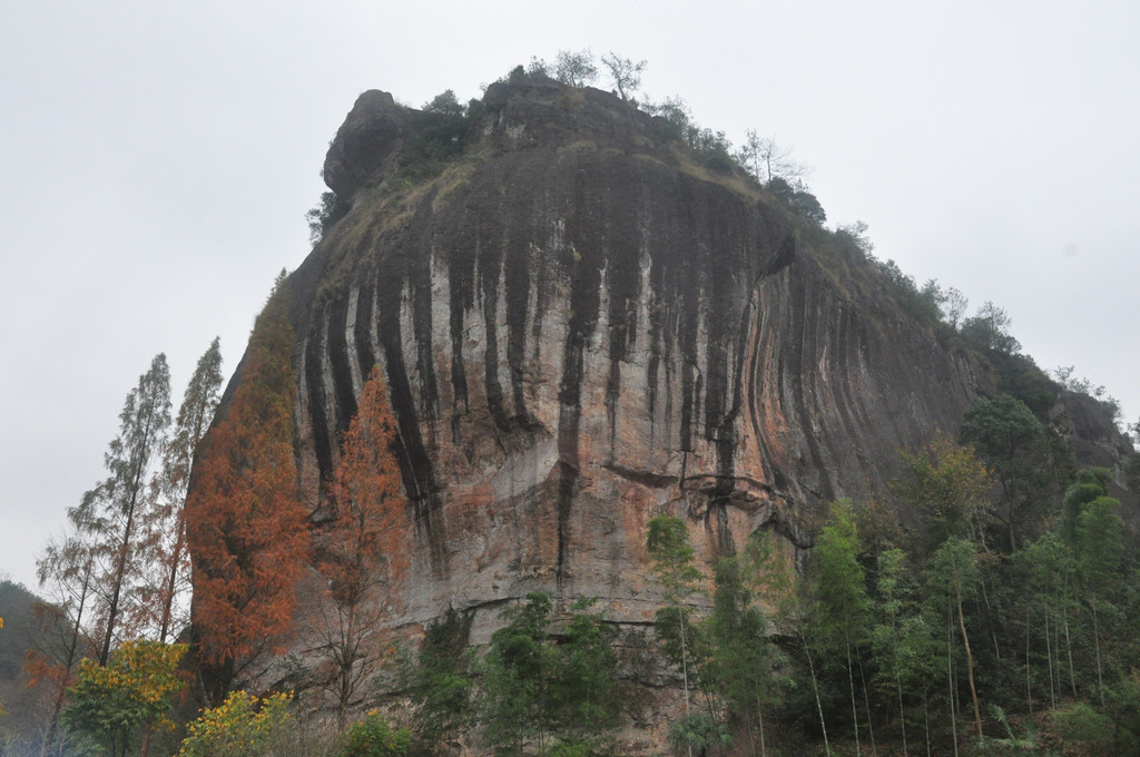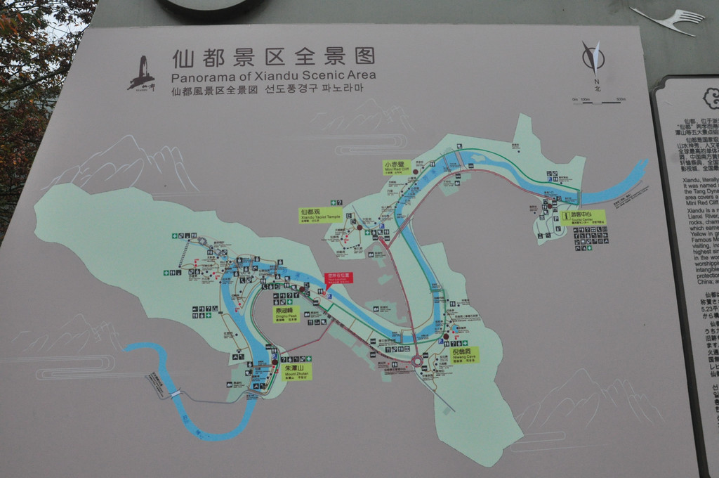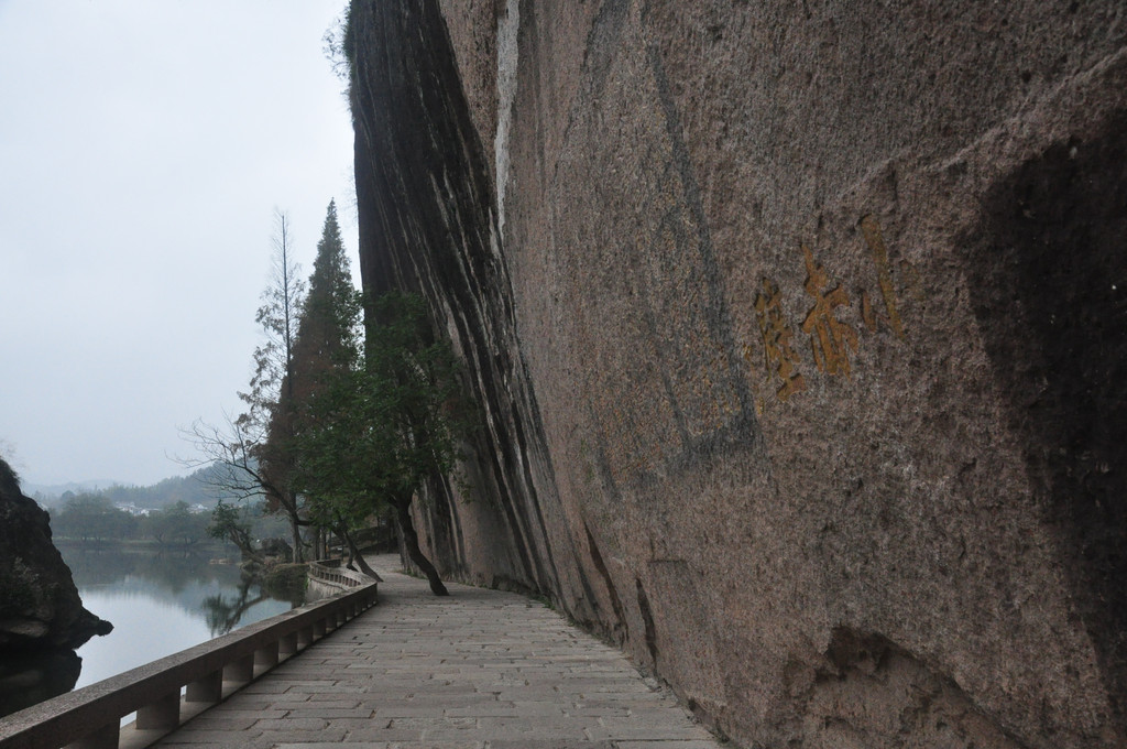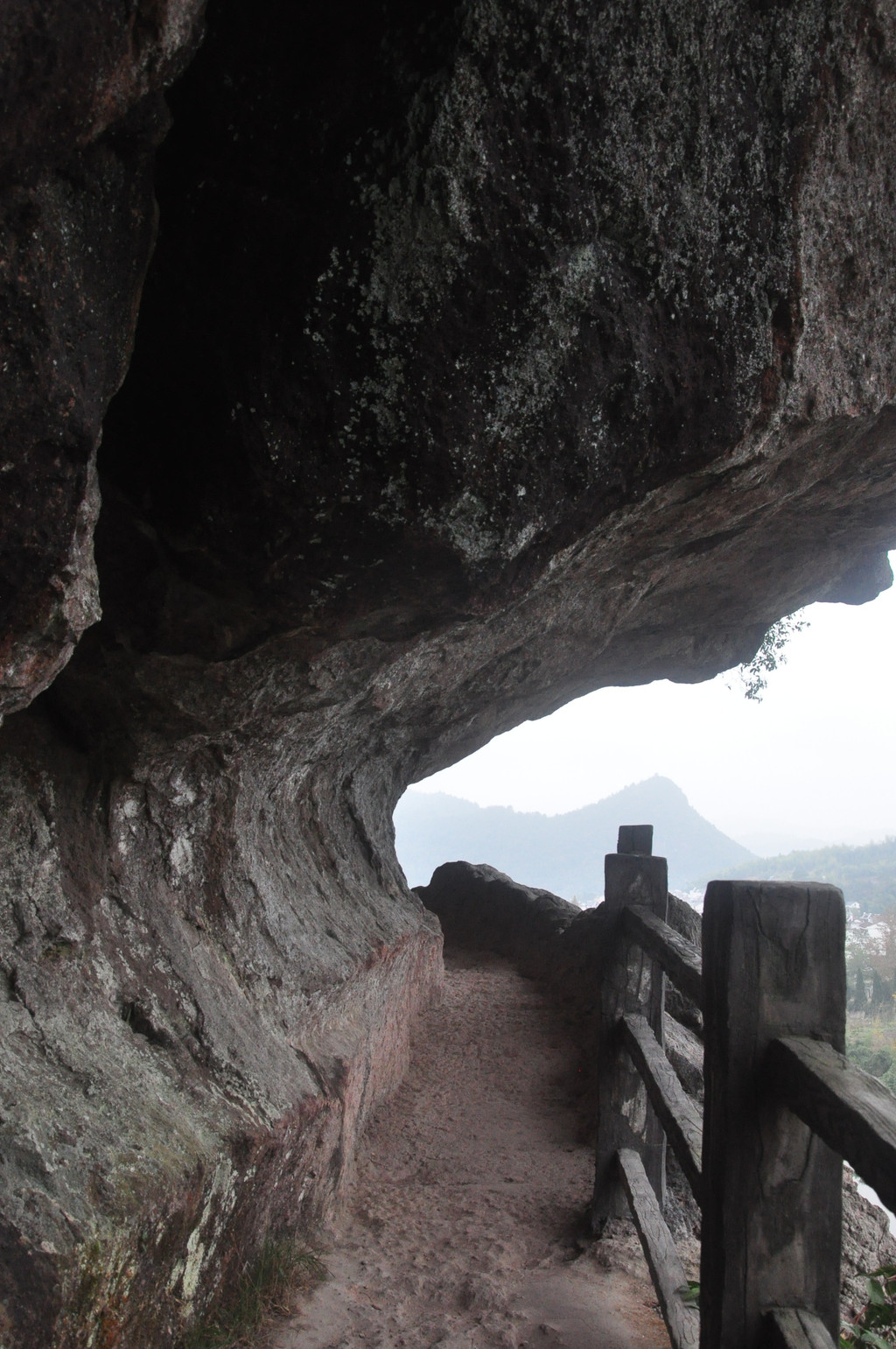 下一个景点按顺序应该是仙都观,但是下车时看到的却是小赤壁,原来那里是仙都观的停车点,也是小赤壁景点的一端,我们以为应该由此游览小赤壁,所以沿着山崖走到另外一端。小赤壁有点丹霞地貌,东西横亘数里地,石壁下部呈赭红色,犹如焰火烧过,故称小赤壁。悬崖中有一天然栈道,长数百米,称龙耕路,相传是东汉光武帝刘秀驾龙耕出来的。龙耕路中有丹室、超妙轩遗址,相传是明吏部天官郑汝壁和状元张懋修(张居正三子)隐居之所。小赤壁一带,溪中有岛,岛中有湖,恰似蓬莱仙境,还有八仙亭、蓬莱阁等人文景观。