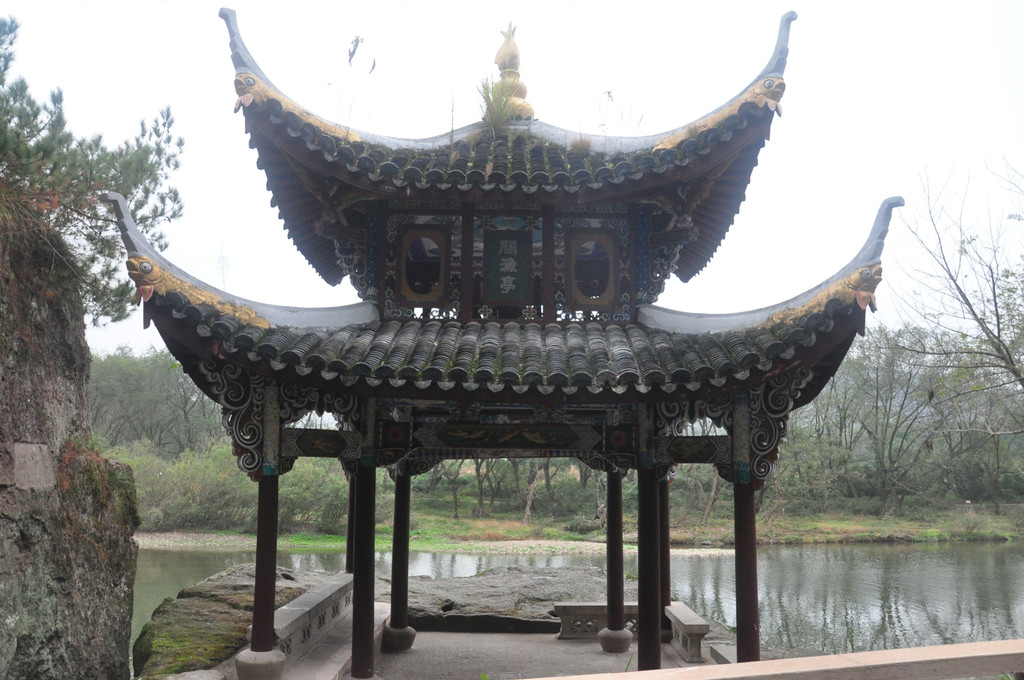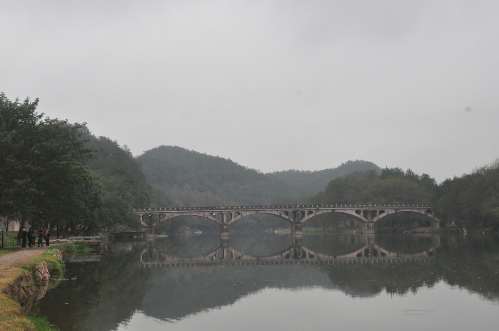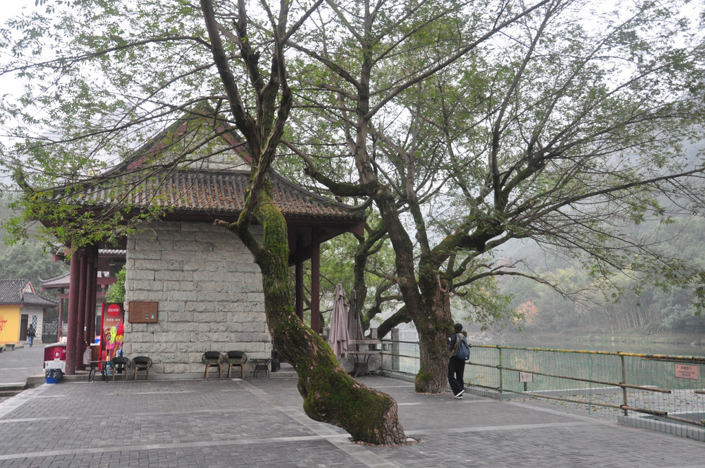 出鼎湖峰,乘车去朱谭山,朱谭山位于仙都景区的最远端,其主要景点有仙堤、晦翁阁、九龙壁、超然亭。仙堤上有座四角攒尖的望峰亭和旁边的水榭,既点缀了风景,又是摄影的最佳取景点。从这里看,岸上的鼎湖峰伟岸挺立,水中的鼎湖峰婀娜多姿,随波摆动。当夕阳的余辉洒上一片金色,岸上与溪中的鼎湖峰都更加美丽动人,宛如天上的琼楼玉宇。赶巧,有人雇佣当地农家作秀拍照,拉一条白色的长烟,算作晨雾,一个穿蓑衣的老农,牵着一头黄牛,后面跟着一位农妇挑着担子,还有一条狗狗,从那座石板桥上走过,背景就是远远的鼎湖峰,好漂亮啊,真像山水画廊。