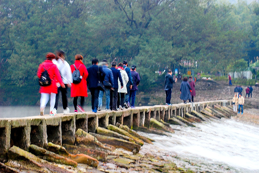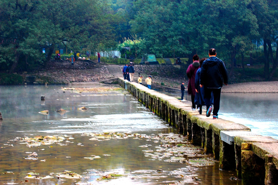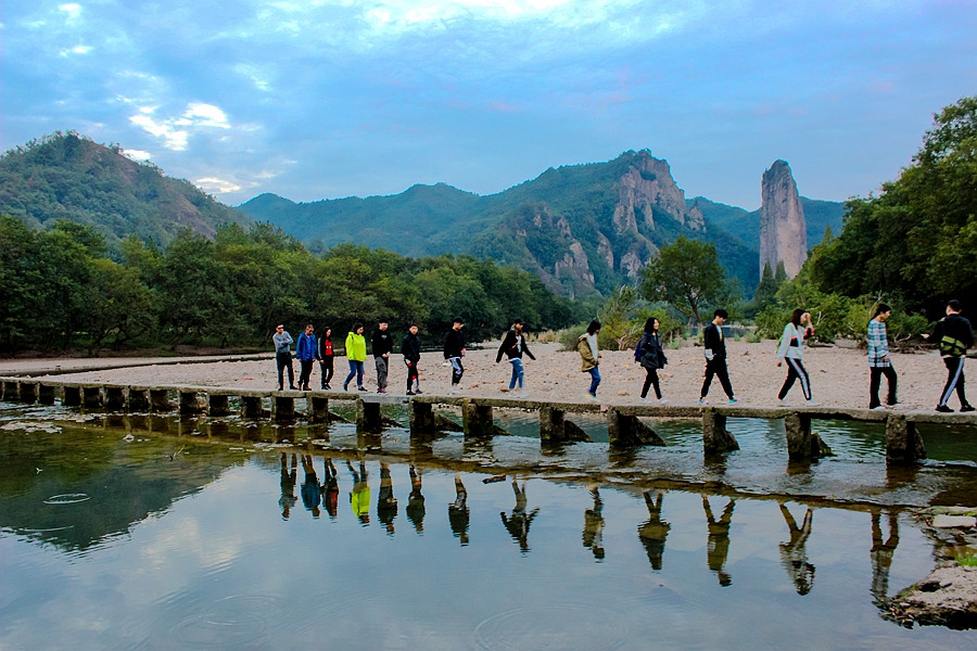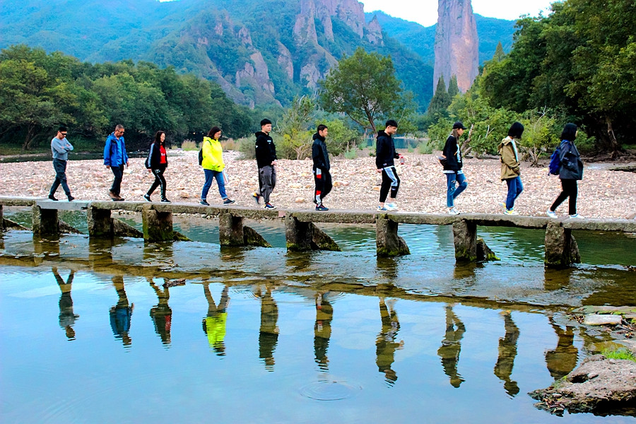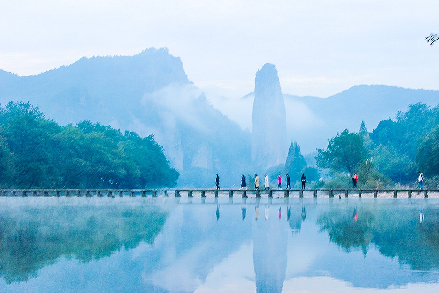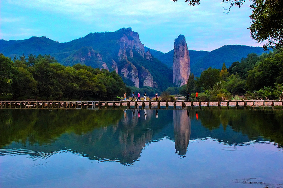 鼎湖峰、练溪水、石梁桥是每个游客拍照留念的最佳取景,人物和鼎湖峰在水中的倒影,你中有我,我中有你……