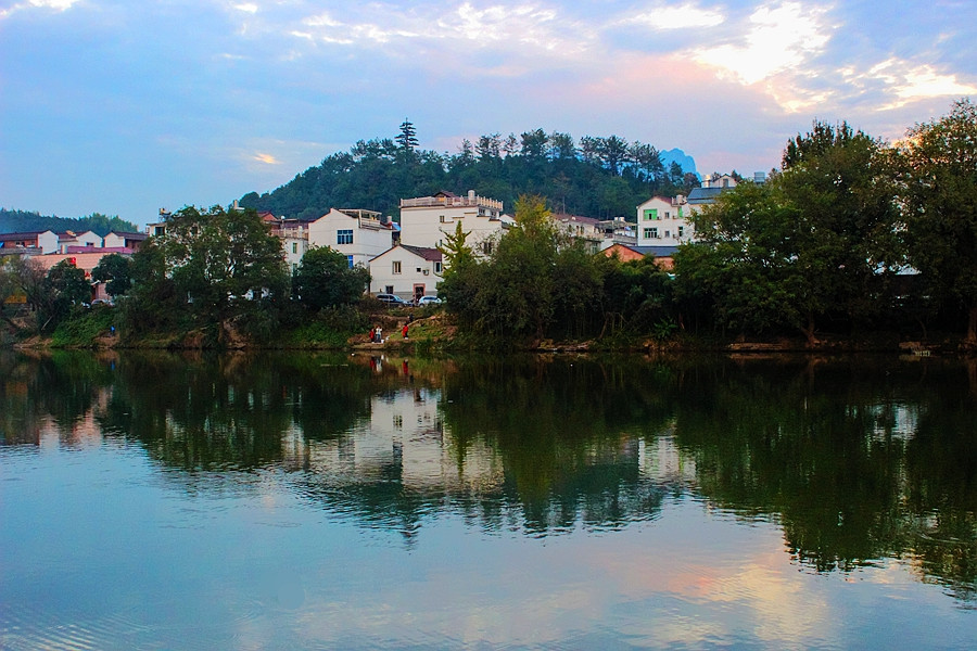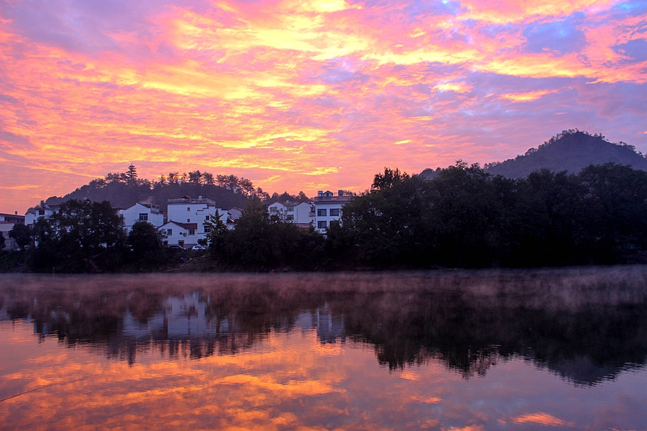 晨光熹微中,湖面上薄雾缭绕,村落笼在淡淡的雾气中。由于云层太厚,没有看到日出,有点小遗憾,但景色还是很不错的。