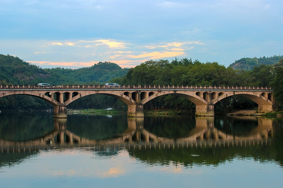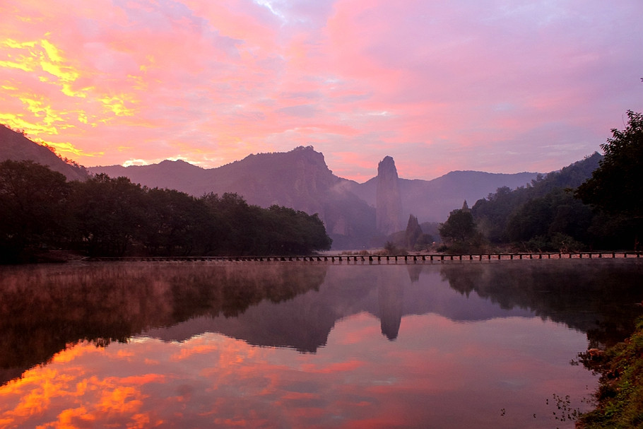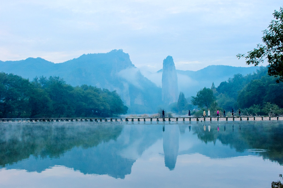 朱潭山不是山,但如诗如画的风光却是仙都的精华,这里是欣赏鼎湖峰的最佳位置。石梁桥的清晨,是拍客们的最爱。日出之后不久,清晨的溪水中升腾起薄雾,远山孤独高耸的鼎湖峰直插飘渺云霄。老农、村妇、牛还有狗在石梁桥上摆着各种组合姿势,还有鼎湖峰的倒影,一组组牛郎织女的神话摄影作品从这里流传出去.....