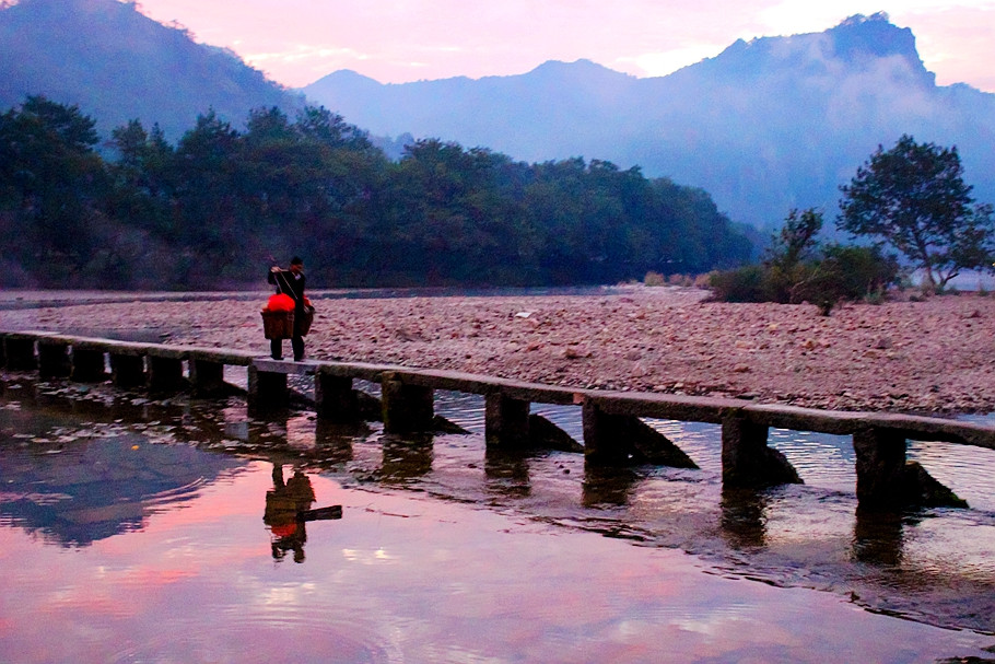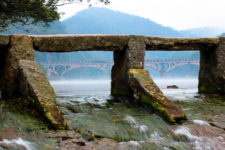 石梁桥的这一侧水面平静,倒影清晰,另一侧却是激流滚滚。