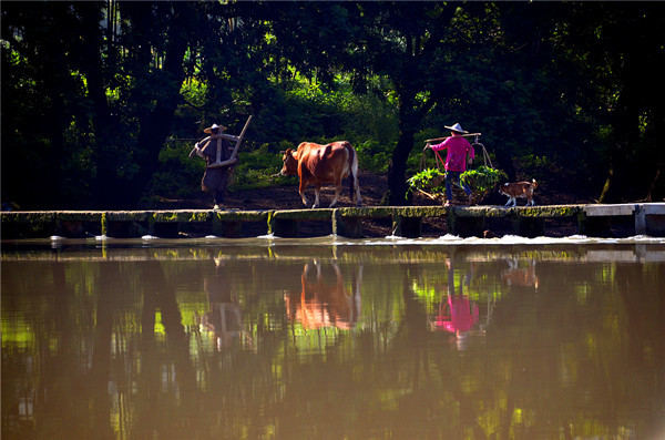 紧接着期待已久的老农牧牛表演开始,一个老农牵着他心爱的老黄牛,带着几十年不离不弃的老伴缓缓地从小石桥的一头走向另一头,此情此景,如诗如画,令人陶醉.