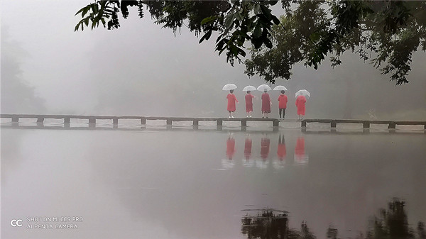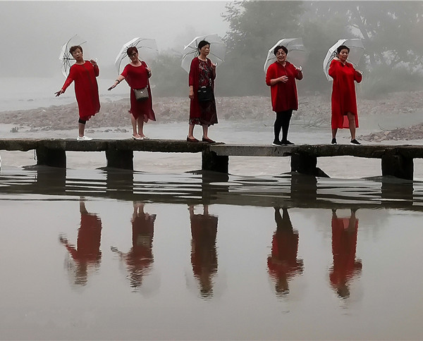 瞧这帮资深美女,全部穿着统一的大红外套,手拿统一的白伞,抓着已不是青春的尾巴,摆着各种POSE,玩得不亦乐乎.