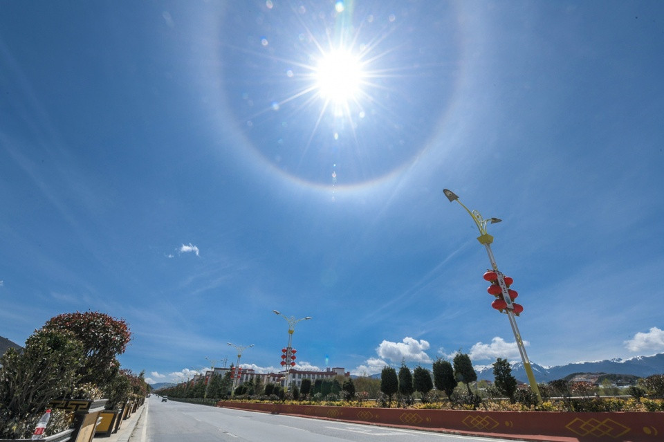 太阳的光晕现象在迪庆是不稀奇的了,而4月份是出现太阳光晕频率最高的季节了。4月份的香格里拉的湿气与气温条件是最容易产生这种现象的了。