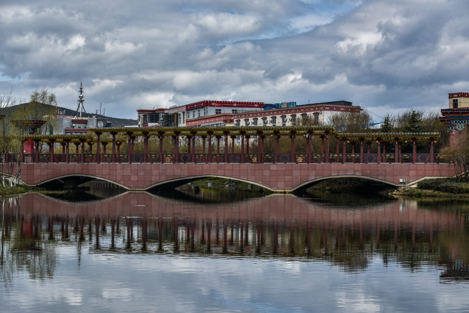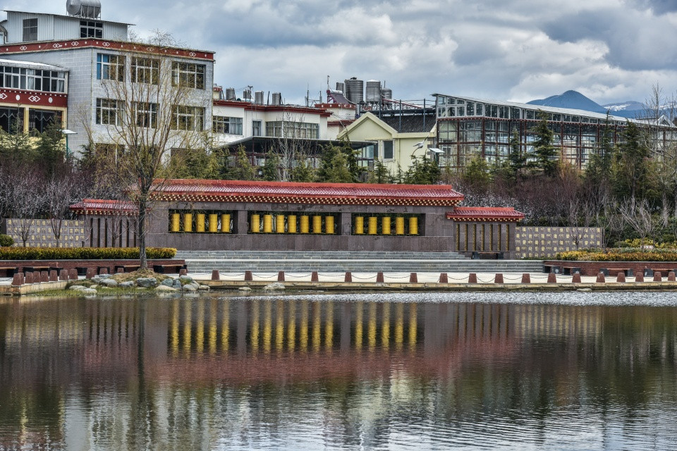 同样是在龙潭河公园,没有雪山的角度来看,就不会觉得像是异国风光特色了,藏族特色建筑已经说明了这是在国内。没想到香格里拉可以将欧洲雪山小镇与中国藏地小镇瞬间切换,感觉很独特吧?