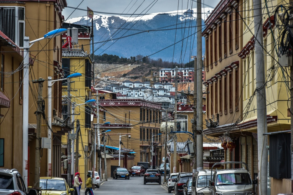 这个季节全国大部分即将或已经进入夏季了,而迪庆州府所在的香格里拉还是白雪皑皑的冬季。远方的雪山与藏地建筑构成了完美的城市画卷。