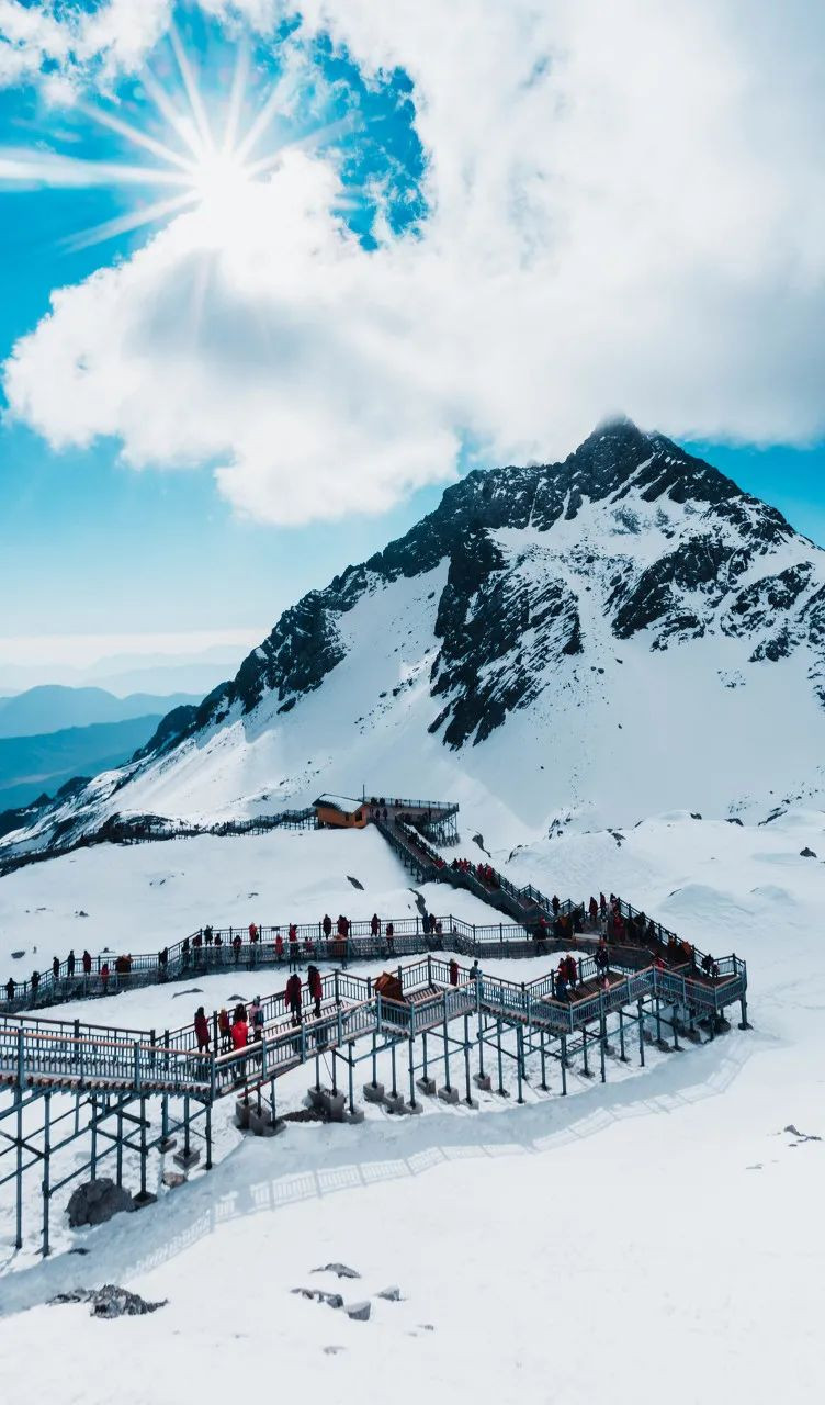 玉龙雪山是纳西人心中的神山,当阳光充足,像是一束束的光线打下来,据说,看到一米阳光的人,会有幸福来敲门。
