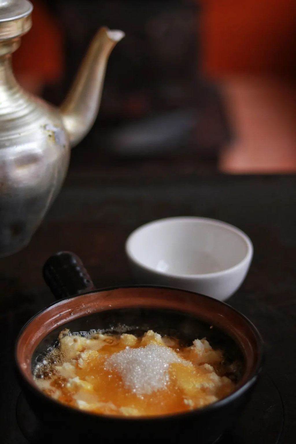 群芳的招牌之一就是酸奶,毕竟这是一个“风吹草低见牛羊”的高原牧区。新鲜牛奶经过发酵沉淀处理后,黄油起锅,把酸奶渣在砂锅里煎成底香脆、里绵软还带点嚼劲的口感,洒上白砂糖来吃,真的太神奇太香太好吃了!广州来的吃货惊为天人!