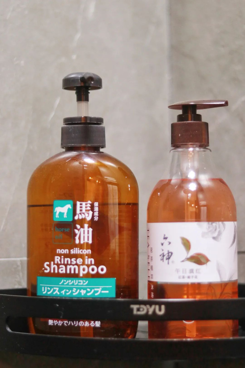 来自日本原产的大瓶装马油洗发水,还有非常点题的六神“午日滇红”沐浴露。在此吹爆国货六神,断货王“滇红”为代表的中国茶系列,气味极其高级、质感极其细腻,容易冲水不紧绷,酒店的选品非常有眼光,我马上被种草下了单!