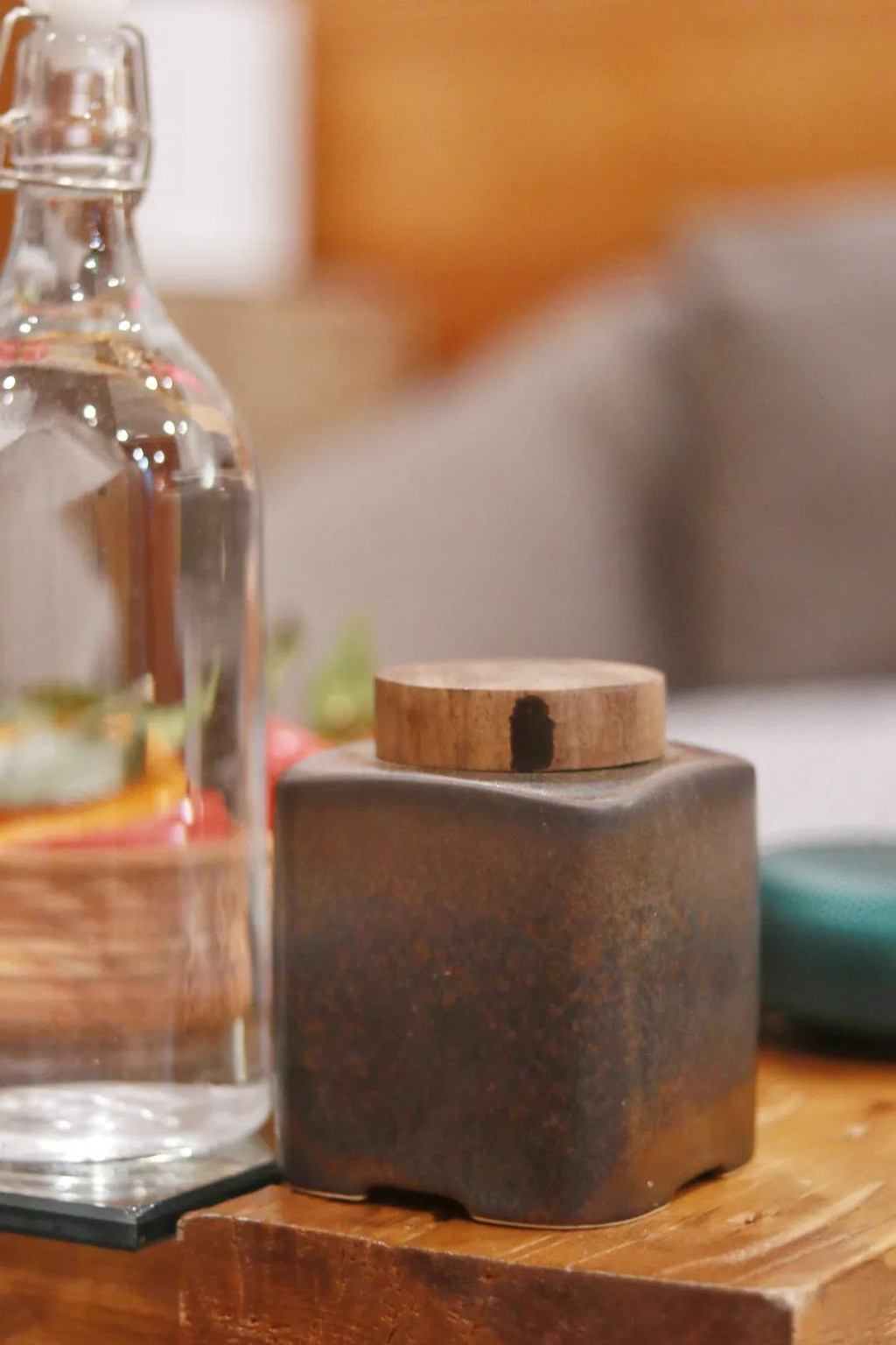 房间在入门当眼的桌面就放置了一系列能提升入住体验的小配件。除了绿得很好看的JBL蓝牙音箱,首先让我产生好奇的就是这个小茶罐: