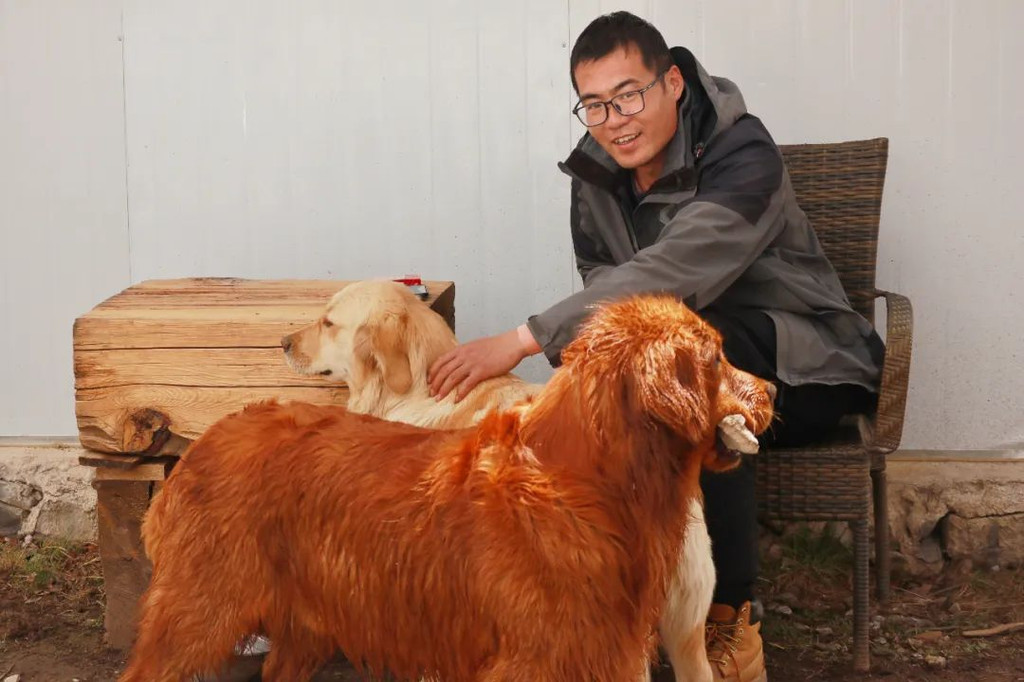 和客人一起来的,还有新的家庭成员:流浪的金毛狗狗“老A”。小两口留下了老A,养得膘肥体壮,还配了媳妇“四喜”。