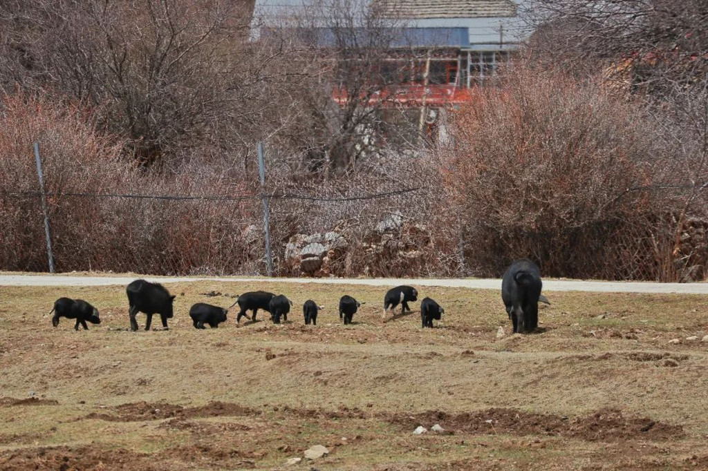 路上遇到附近农户散养的黑猪妈妈带宝宝野外觅食