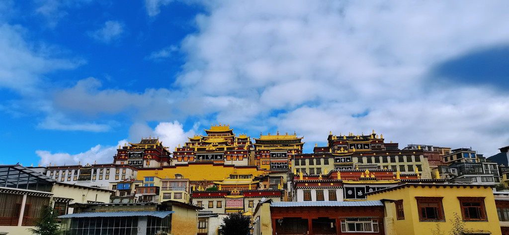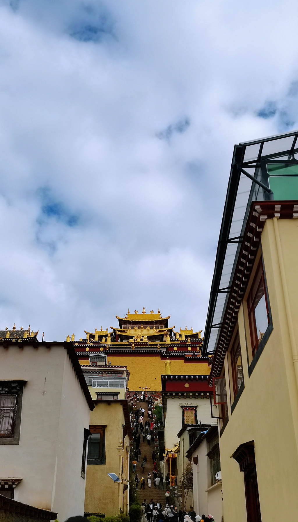 第二天早上的行程是参观噶丹松赞林寺,我俩到景区门口已是十点多,松赞林寺要穿过村子,在背后山上依山而建,景区在村外就早早把好关,除非当地车辆,私自开车不准进去,只能从景区门口坐摆渡车,进去到山脚有十多分钟。松赞林寺是西南地区规模最大的藏传佛教寺院,与布达拉宫一样依山而建,主寺在山顶,下面分布着各康参和僧众的住所,素有小布达拉宫之称。