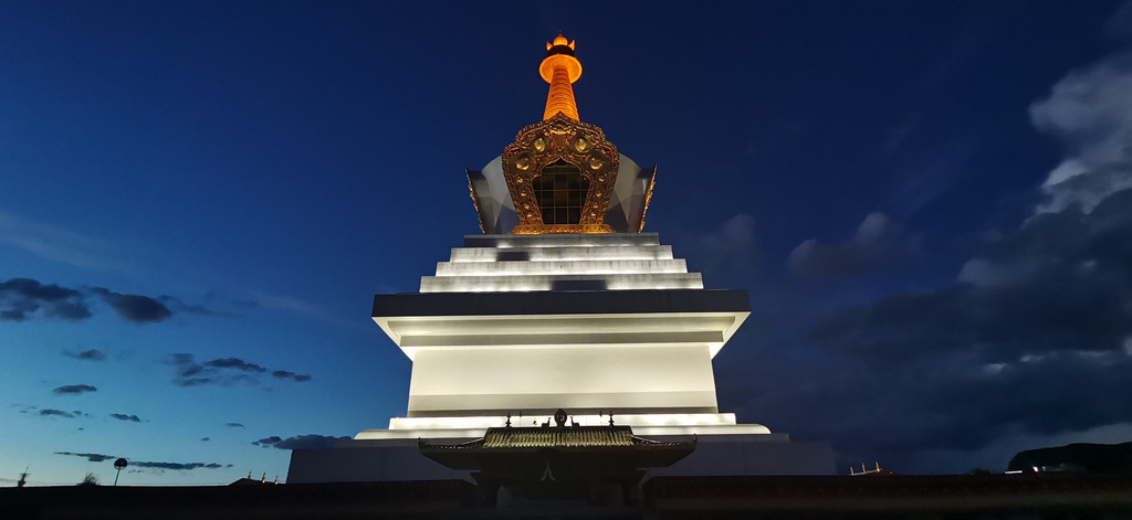 提前在独克宗古城订了一家酒店,回到城中太阳已经完全落下了,月上屋梢,去和谐塔中塔工作人员下班了进不去,在外面拍了照,月光下别有一番感受。