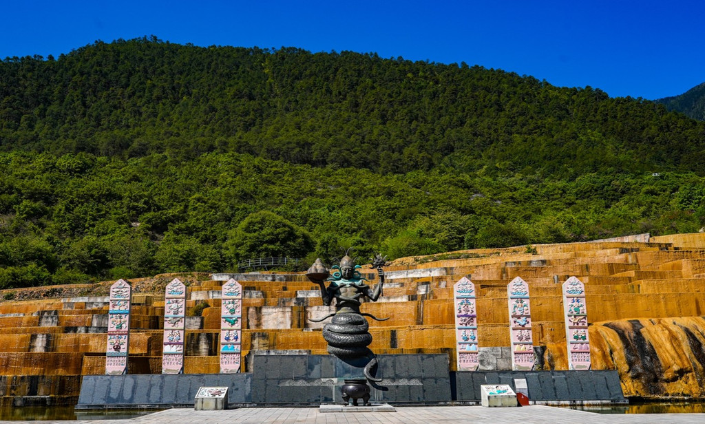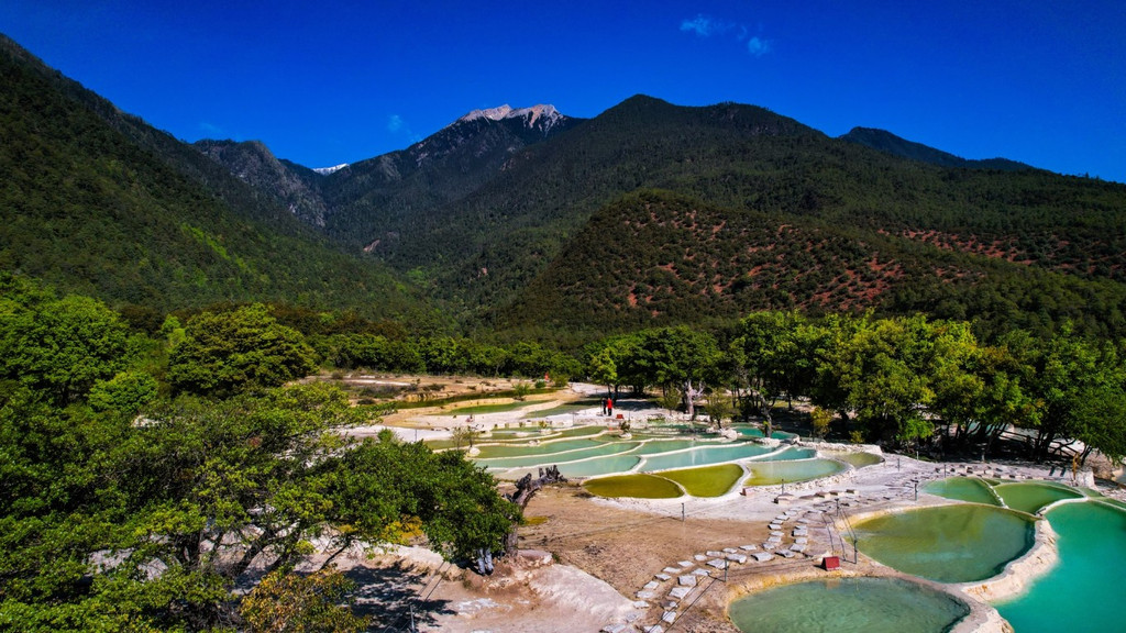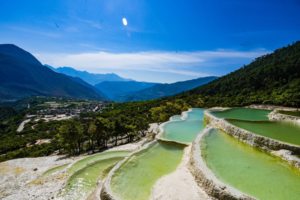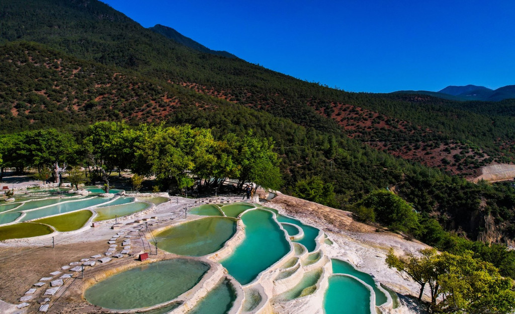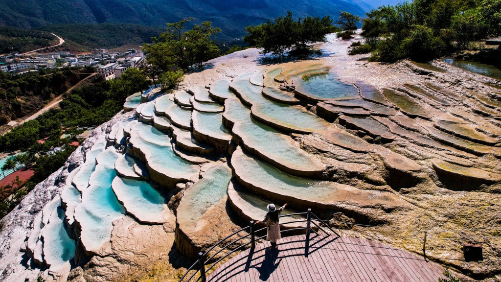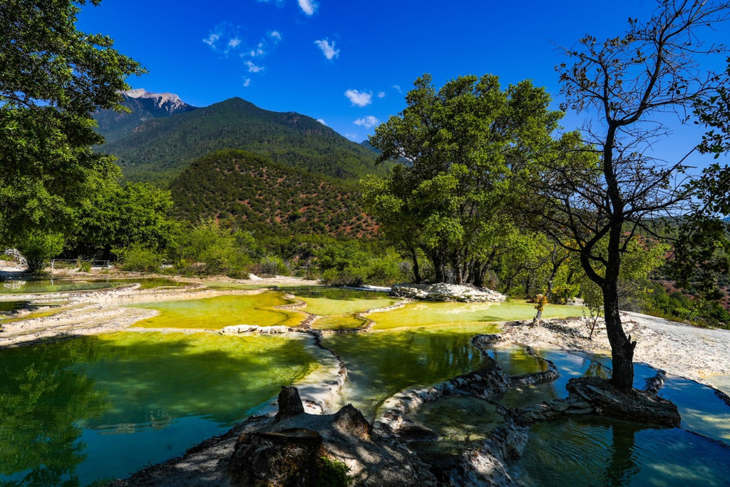 白水台其实是由于碳酸钙溶解于泉水中而形成的自然奇观。含碳酸钙的泉水慢慢下流,碳酸钙逐渐沉淀,长年累月就形成台幔,这里的泉水清澈见底,台幔如同白色的绸带般层层叠叠,好似层层梯田,美轮美奂。也如同一颗璀璨的明珠,静静地镶嵌在大地之上。
